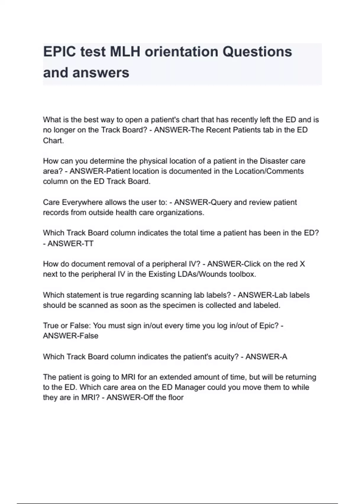 EPIC test MLH orientation Questions and answers