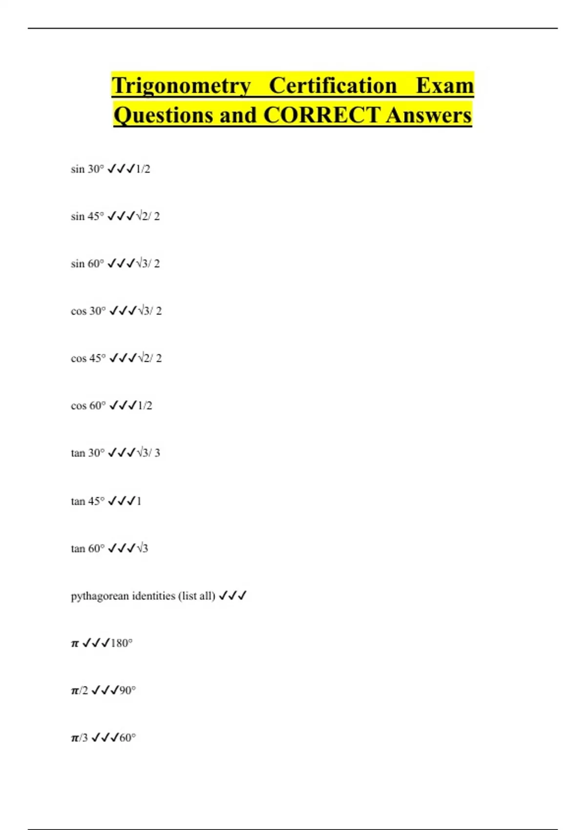 Trigonometry Certification Exam Questions and CORRECT Answers