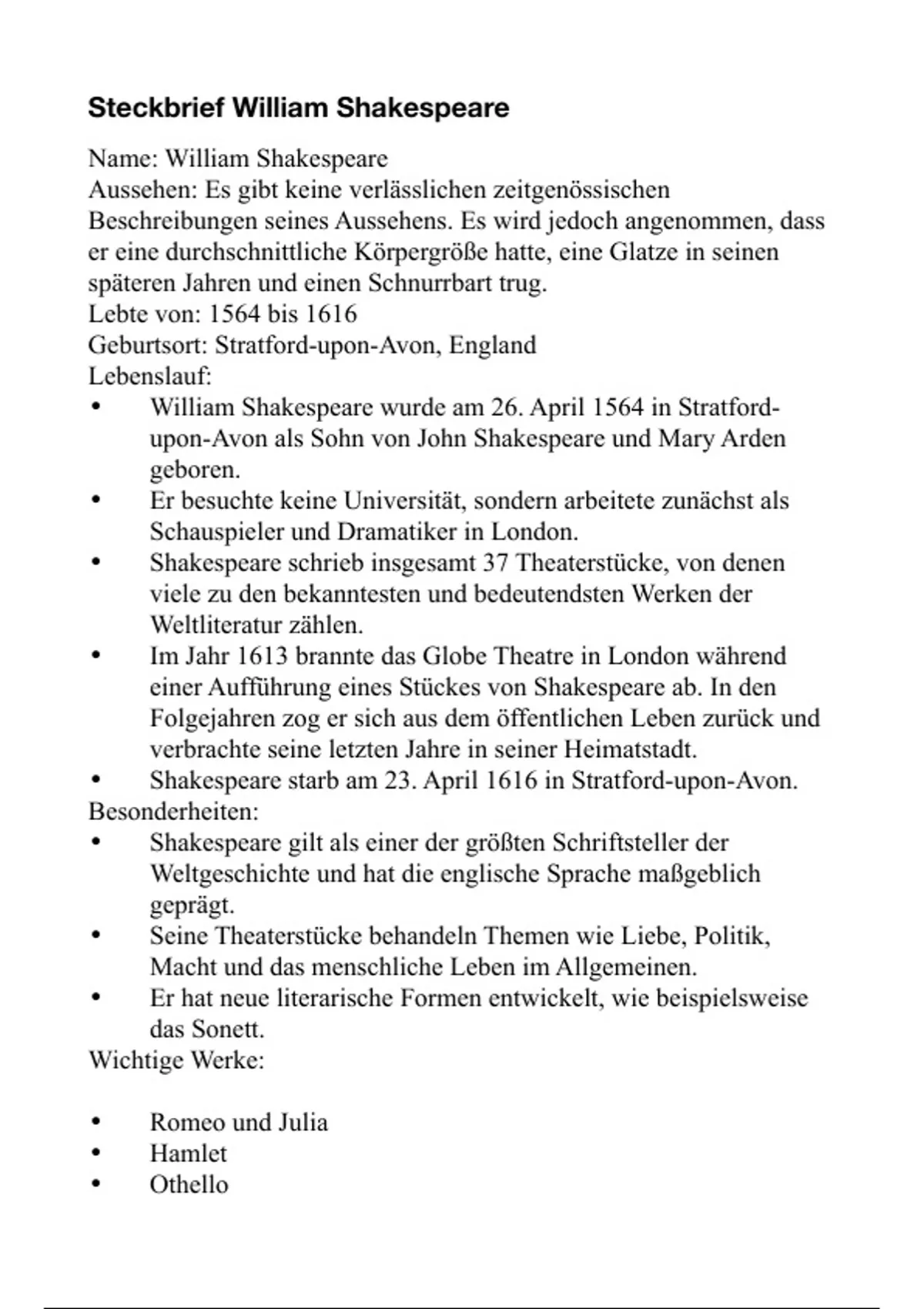 Steckbrief William Shakespeare