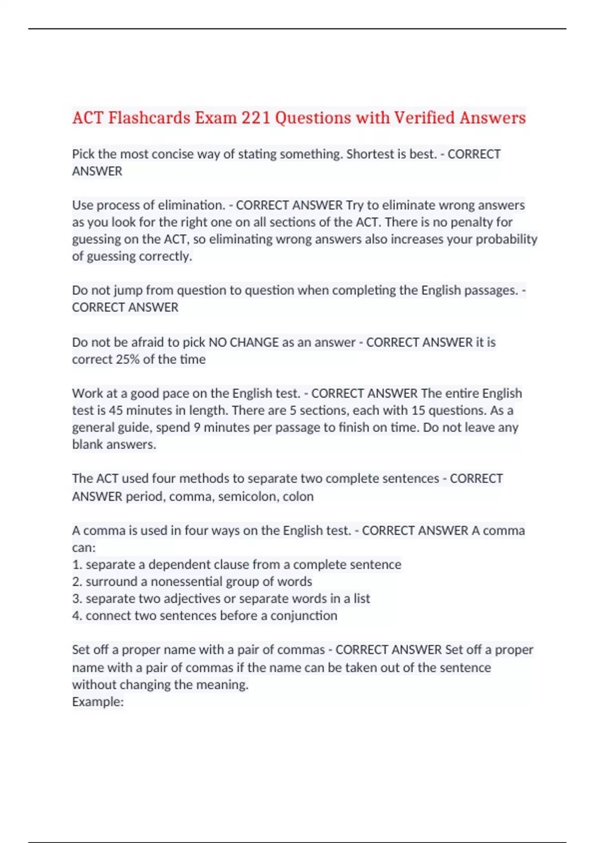 ACT Flashcards Exam 221 Questions with Verified Answers Pick the most concise way of stating something. Shortest is best. - CORRECT ANSWER Use process of elimination. - CORRECT ANSWER Try to eliminate wrong answers as you look for the right one on all sections of the ACT. There is no penalty for guessing on the ACT, so eliminating wrong answers also increases your probability of guessing correctly. Do not jump from question to question when completing the English passages. - CORRECT ANSWER Do not be afraid to pick NO CHANGE as an answer - CORRECT ANSWER it is correct 25% of the time Work at a good pace on the English test. - CORRECT ANSWER The entire English test is 45 minutes in length. There are 5 sections, each with 15 questions. As a general guide, spend 9 minutes per passage to finish on time. Do not leave any blank answers. The ACT used four methods to separate two complete sentences - CORRECT ANSWER period, comma, semicolon, colon A comma is used in four ways on the English test. - CORRECT ANSWER A comma can: 1. separate a dependent clause from a complete sentence 2. surround a nonessential group of words 3. separate two adjectives or separate words in a list 4. connect two sentences before a conjunction Set off a proper name with a pair of commas - CORRECT ANSWER Set off a proper name with a pair of commas if the name can be taken out of the sentence without changing the meaning. Example: Our 44th President was born in Honolulu, Hawaii. Our 44th President, Barack Obama, was born in Honolulu, Hawaii. This example doesn't work: The songwriter Bob Dylan is considered a lyrical genius. The songwriter is considered a lyrical genius. A colon is used in two ways on the English test. - CORRECT ANSWER 1. Use a colon after a complete sentence that introduces either a list or an explanation. 2. Use a colon between two sentences when the second sentence explains the first. Use a dash in two ways on the English test. - CORRECT ANSWER 1. Use dashes instead of commas to surround a group of nonessential words. 2. Dashes are usually used for emphasis. Check subject-verb and subject-pronoun agreement. - CORRECT ANSWER Long sentences are often filled with interrupting details in the English passages. Subjects can be far from the verb or pronoun with which they agree. Ask yourself who or what is doing the action or what word is being replaced with a pronoun Know the difference between its, it's, and its' - CORRECT ANSWER Its is possessive it's is a contraction of 'it is' its' is not a thing Being is frequently an answer choice but virtually never correct. - CORRECT ANSWER Do mot use being as a synonym for because or for is Being is rarely correct on the ACT Be careful of the way ACT uses the word although. - CORRECT ANSWER The addition of although at the beginning of a sentence turns it from an independent clause into a dependent one. If a sentence was correct with although and then you either delete or change although to something else, you have a created a run-on sentence Do not be tricked by "suppose the writer's goal. . . " questions. - CORRECT ANSWER Reasons to choose DELETE on answer choices. - CORRECT ANSWER Use OMIT/Delete when: 1. The underlined portion is redundant 2. The underlined portion explains something that the reader already knows. 3. The underlined portion gives an unnecessary definition for a common word. Learn when to add a phrase or sentence. - CORRECT ANSWER Do not add a new phrase or sentence without reading the previous sentence and the sentence that follows. One of those two sentences often contains a clue that helps you determine when to add the suggested sentence Identify the subject of the sentence below Evidence that humans are slowly evolving into two different species is being ignored by scientists. - CORRECT ANSWER Subject: Evidence Transitions made easy - CORRECT ANSWER 1. Moreover 2. Meanwhile 3. Additionally 4. Furthermore Nouns and pronouns can be the object of a verb or preposition - CORRECT ANSWER Active voice is preferable to passive voice. - CORRECT ANSWER Passive voice reverse normal syntax by making the subject of object and the object the subject. It frequently involves adding a proposition. At other times, passive voice makes the object the subject and omits the subject entirely (for example, "The lamp got broken" instead of "I broke the lamp"). Although the passive voice is not technically grammatically incorrect, it is considered awkward and unnecessary. You should avoid picking answer choices that involve the passive voice unless something is even more wrong with all of the other choices. Answering illustrate/support questions. - CORRECT ANSWER If a question asks which answer best illustrates or supports, pick the choice that gives the most specific details/examples. Beware of not/least acceptable questions - CORRECT ANSWER When to use 'who' or 'whom' on the English test. - CORRECT ANSWER Who is a subject pronoun and does the action. EX: Who threw the ball? Whom is an object pronoun and receives the action. EX: The ball was thrown to whom? Similar words- different meanings. - CORRECT ANSWER Review words that are often used and confused Then - Than The group studied hard and then took the test. (sequence) The local team scored better than the visiting team. (compares) Who's-Whose Who's coming to dinner? (who is) Whose book is this? (possessive) The evidence that hyenas are more closely related to mongooses than they are to either *dogs or cats is* both surprising and indisputable. A. NO CHANGE B. dogs or cats are C. dogs and cats are D. dogs and cats is - CORRECT ANSWER 'A' is correct because the subject is evidence, which is singular If any college student wants to make sure of joining a rock band at school, *you* would be wise to learn bass or drums because singers and guitarists are a dime a dozen. A. NO CHANGE B. one C. they D. he or she - CORRECT ANSWER 'D' is correct because the main subject of the sentence is, 'college student', is third-person s