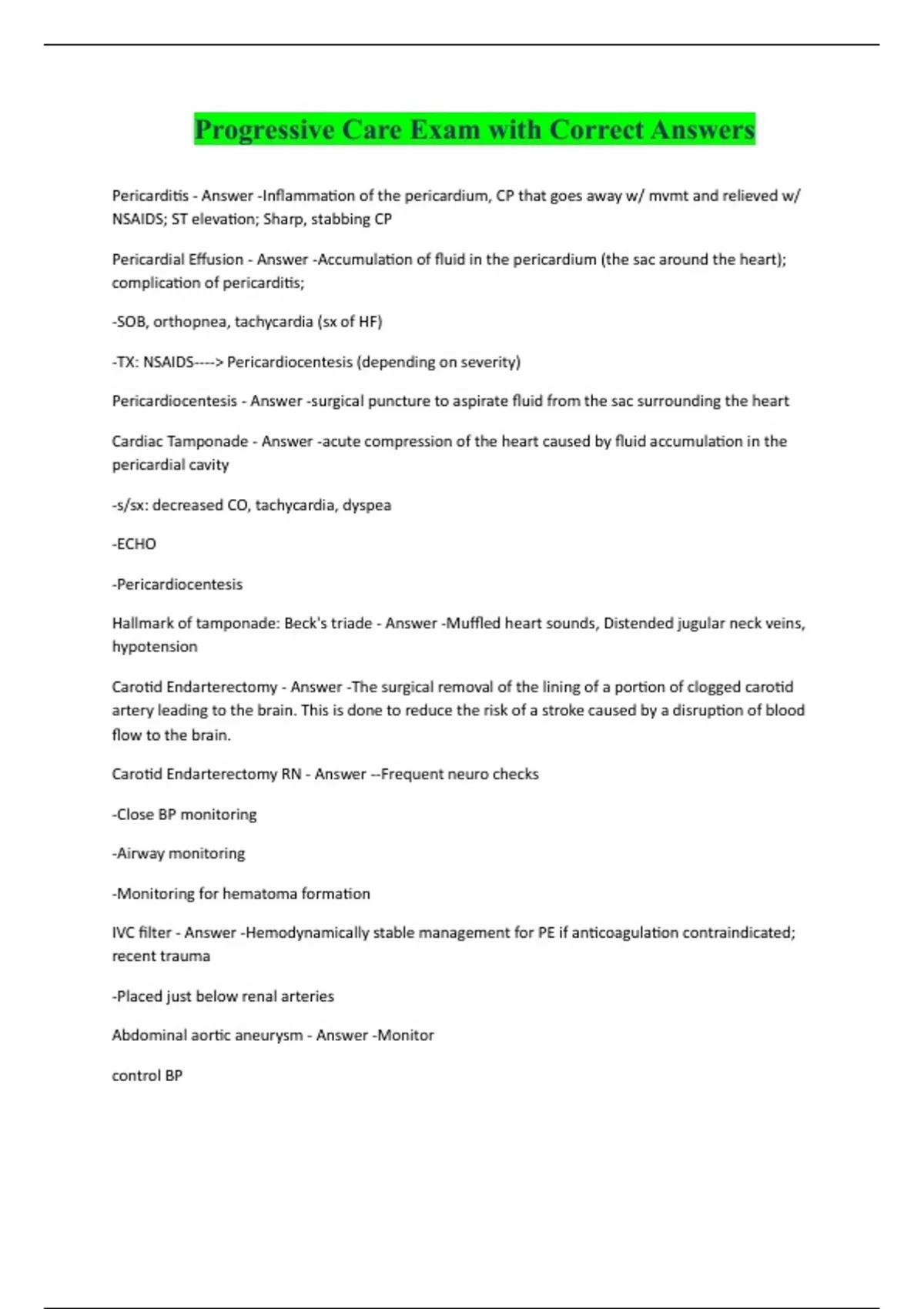 Progressive Care Exam with Correct Answers Pericarditis - Answer -Inflammation of the pericardium, CP that goes away w/ mvmt and relieved w/ NSAIDS; ST elevation; Sharp, stabbing CP Pericardial Effusion - Answer -Accumulation of fluid in the pericardium (the sac around the heart); complication of pericarditis; -SOB, orthopnea, tachycardia (sx of HF) -TX: NSAIDS---- Pericardiocentesis (depending on severity) Pericardiocentesis - Answer -surgical puncture to aspirate fluid from the sac surrounding the heart Cardiac Tamponade - Answer -acute compression of the heart caused by fluid accumulation in the pericardial cavity -s/sx: decreased CO, tachycardia, dyspea -ECHO -Pericardiocentesis Hallmark of tamponade: Beck's triade - Answer -Muffled heart sounds, Distended jugular neck veins, hypotension Carotid Endarterectomy - Answer -The surgical removal of the lining of a portion of clogged carotid artery leading to the brain. This is done to reduce the risk of a stroke caused by a disruption of blood flow to the brain. Carotid Endarterectomy RN - Answer --Frequent neuro checks -Close BP monitoring -Airway monitoring -Monitoring for hematoma formation IVC filter - Answer -Hemodynamically stable management for PE if anticoagulation contraindicated; recent trauma
