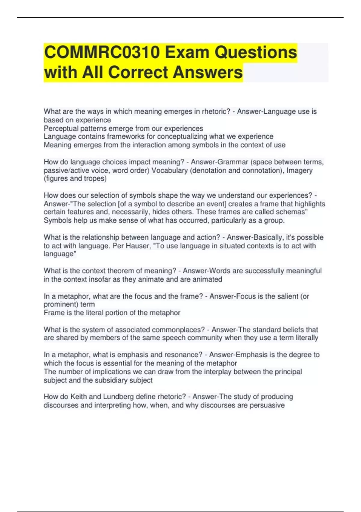 COMMRC0310 Exam Questions with All Correct Answers What are the ways in which meaning emerges in rhetoric? - Answer-Language use is based on experience Perceptual patterns emerge from our experiences Language contains frameworks for conceptualizing what we experience Meaning emerges from the interaction among symbols in the context of use How do language choices impact meaning? - Answer-Grammar (space between terms, passive/active voice, word order) Vocabulary (denotation and connotation), Imagery (figures and tropes) How does our selection of symbols shape the way we understand our experiences? - Answer-"The selection [of a symbol to describe an event] creates a frame that highlights certain features and, necessarily, hides others. These frames are called schemas" Symbols help us make sense of what has occurred, particularly as a group. What is the relationship between language and action? - Answer-Basically, it's possible to act with language. Per Hauser, "To use language in situated contexts is to act with language" What is the context theorem of meaning? - Answer-Words are successfully meaningful in the context insofar as they animate and are animated In a metaphor, what are the focus and the frame? - Answer-Focus is the salient (or prominent) term Frame is the literal portion of the metaphor What is the system of associated commonplaces? - Answer-The standard beliefs that are shared by members of the same speech community when they use a term literally In a metaphor, what is emphasis and resonance? - Answer-Emphasis is the degree to which the focus is essential for the meaning of the metaphor The number of implications we can draw from the interplay between the principal subject and the subsidiary subject How do Keith and Lundberg define rhetoric? - Answer-The study of producing discourses and interpreting how, when, and why discourses are persuasive Who were the Sophists and why were they important? - Answer-Traveling teachers who started to teach Athenians how to speak persuasively with the goal of navigating the courts and senate What was Plato's criticism of rhetoric? - Answer-That it was a disconnected set of techniques without a central ethical concern or philosophical system What are Aristotle's three types of speeches? What do they do? - Answer-Forensic (courtroom setting, about what happened, past oriented) Epideictic (ceremonial [e.g. funeral] setting, about praising/blaming, aimed at emphasizing/showing forth particular qualities in someone) Deliberative (lawmaking setting [e.g. floor of Congress], about what community should do, future oriented) What are the three types of rhetorical appeals or proofs? - Answer-Ethos Pathos Logos What three basic points did Aristotle argue about rhetoric? - Answer-First, rhetoric can be treated as a coherent area of inquiry Second, rhetoric and logic are necessary counterparts Third, the forms and functions of speeches are shaped by the possible speech goals How do Keith and Lundberg define identity? - Answer-The set of labels, patterns behavior, and ways of representing yourself that make up your public persona What is the herd instinct? - Answer-The tendency to keep our beliefs, and thus our actions, within the bounds of what society will accept What is culture lag? - Answer-The tendency of practices and beliefs to persist long after whatever conditions made them useful or sensible have disappeared What is provincialism? - Answer-The tendency to see things from the point of view of our primary culture, especially when there is conflict with other groups What is prejudice? - Answer-Thinking ill of others without sufficient warrant What are scapegoats? - Answer-Others we can blame for the ills of the world What is a partisan mind-set? - Answer-Leads people to perceive evidence and to judge arguments via an 'us against them' or a 'my right view against your wrong view' attitude What is confirmation bias? - Answer-Tendency of people to interpret messages so as to confirm their existing view of the world What is the difference between wishful thinking and self-deception? - Answer-Wishful thinking - believing something we would like to be true no matter what the evidence Self-deception - consciously believing what, at a deeper level, we know to be dubious What is rationalization? - Answer-When we ignore or deny unpleasant evidence so as to feel justified in doing what we want to do or in believing what we find comfortable to believe What is procrastination? - Answer-To put off for tomorrow what common sense tells us should be done today What is the difference between suppression and denial? - Answer-Suppression - when we avoid thoughts that are stressful by either not thinking about them or, more commonly, by thinking non-stressful thoughts. What does Hauser contend that rhetorical communication is typically concerned with? - Answer-Bringing about agreement, often with the further goal of eliciting action What are the four possible modes used in the typical manner of reasoning? - Answer- Definition - assert the basic nature of the subject Similitude - reason to the probability of a conclusion from the similarity of a new situation to a known one Cause and effect - emphasizes the developmental features of a situation rather than its essence Circumstances - appeals to the force of immediate facts What is rhetorical framing? - Answer-Propounding a view of the world that both legitimates and motivates action What is a syllogism? - Answer-A formal deductive argument made up of a major premise, a minor premise, and a conclusion in which, if the premises are true, the conclusion must be true. What is an enthymeme? - Answer-A syllogism with one missing premise, usually supplied by the audience (thereby involving them in the process of their own persuasion) What is anaphora? - Answer-the repetition of a word or phrase at the beginning of successive phrases, clauses or lines. What is an argument from consequences? - Answer-An argument that an idea or 