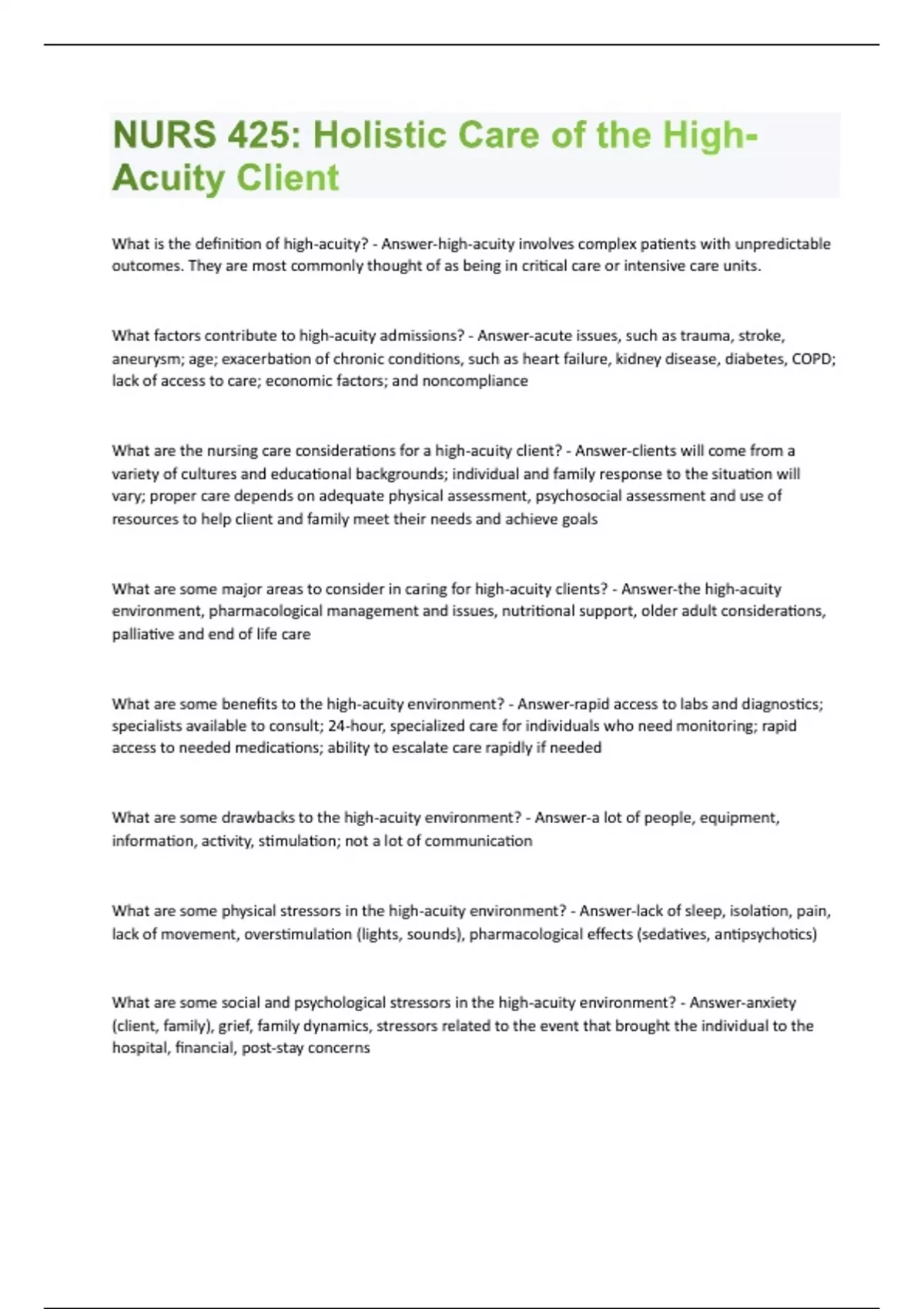 NURS 425: Holistic Care of the High-Acuity Client Complete Questions And Answers
