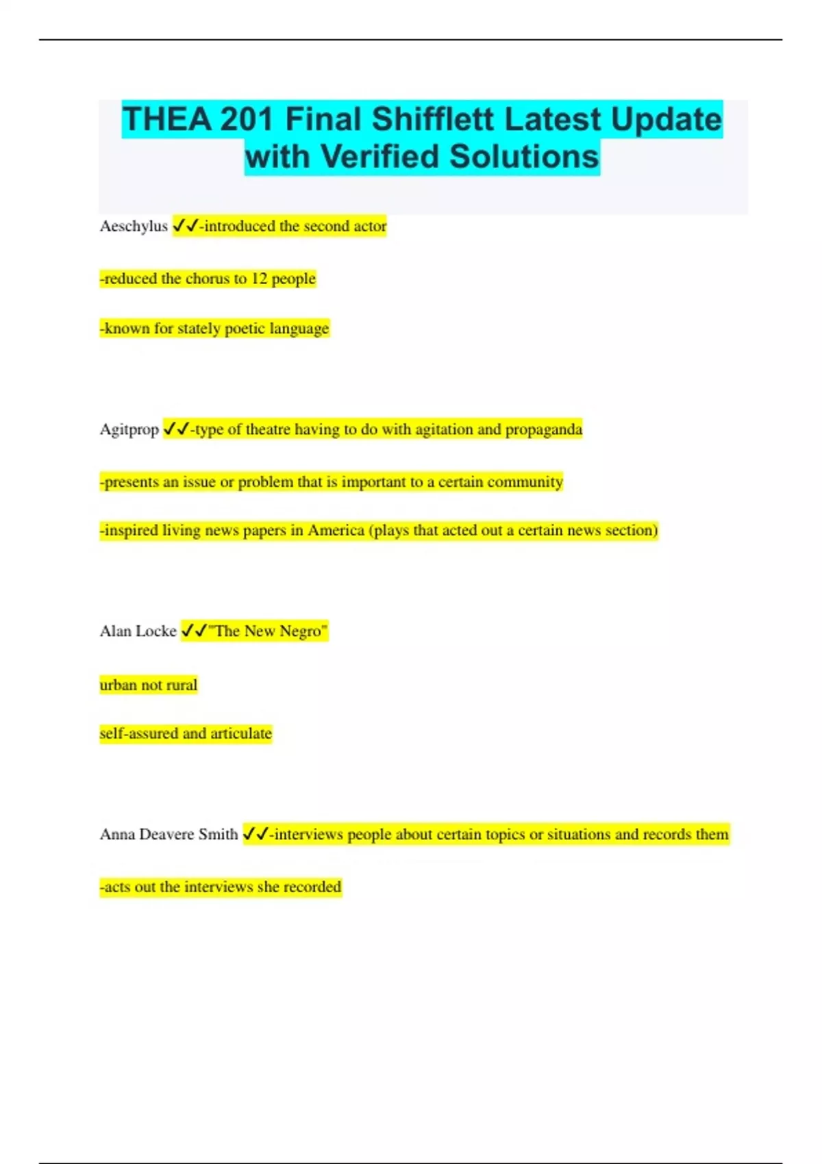 THEA 201 Final Shifflett Latest Update with Verified Solutions Aeschylus -introduced the second actor -reduced the chorus to 12 people -known for stately poetic language Agitprop -type of theatre having to do with agitation and propaganda -presents an issue or problem that is important to a certain community -inspired living news papers in America (plays that acted out a certain news section) Alan Locke "The New Negro" urban not rural self-assured and articulate Anna Deavere Smith -interviews people about certain topics or situations and records them -acts out the interviews she recorded Annual Play Competition -held in Dionysia -competition between 4 playwrights -each turned in 3 tragedies and 1 satyr play Aragoto a bold heroic character easily identified by red, white, and black makeup Aristotle -taught by Plato -observed world around him and looked for ways to explain it Aspects of Chinese Theatre -performance texts come from well-known stories -integrated forms include speaking, singing, and acrobatics -usually a bare stage -elaborate costumes and makeup -Jingxi= Beijing Opera August Wilson -Pittsburg cycle -wrote plays from a black perspective from each decade in the 20th century -"Fences" Augusto Boal (Brazilian) -focus on theatre as an art -theatre is communication, not just entertainment -engaging students into the convo leads to new knowledge -used theatre to analyze, discuss, and find solutions to problems -wanted active audiences Bertoit Brecht -German playwright between the world wars -liked Communist ideals