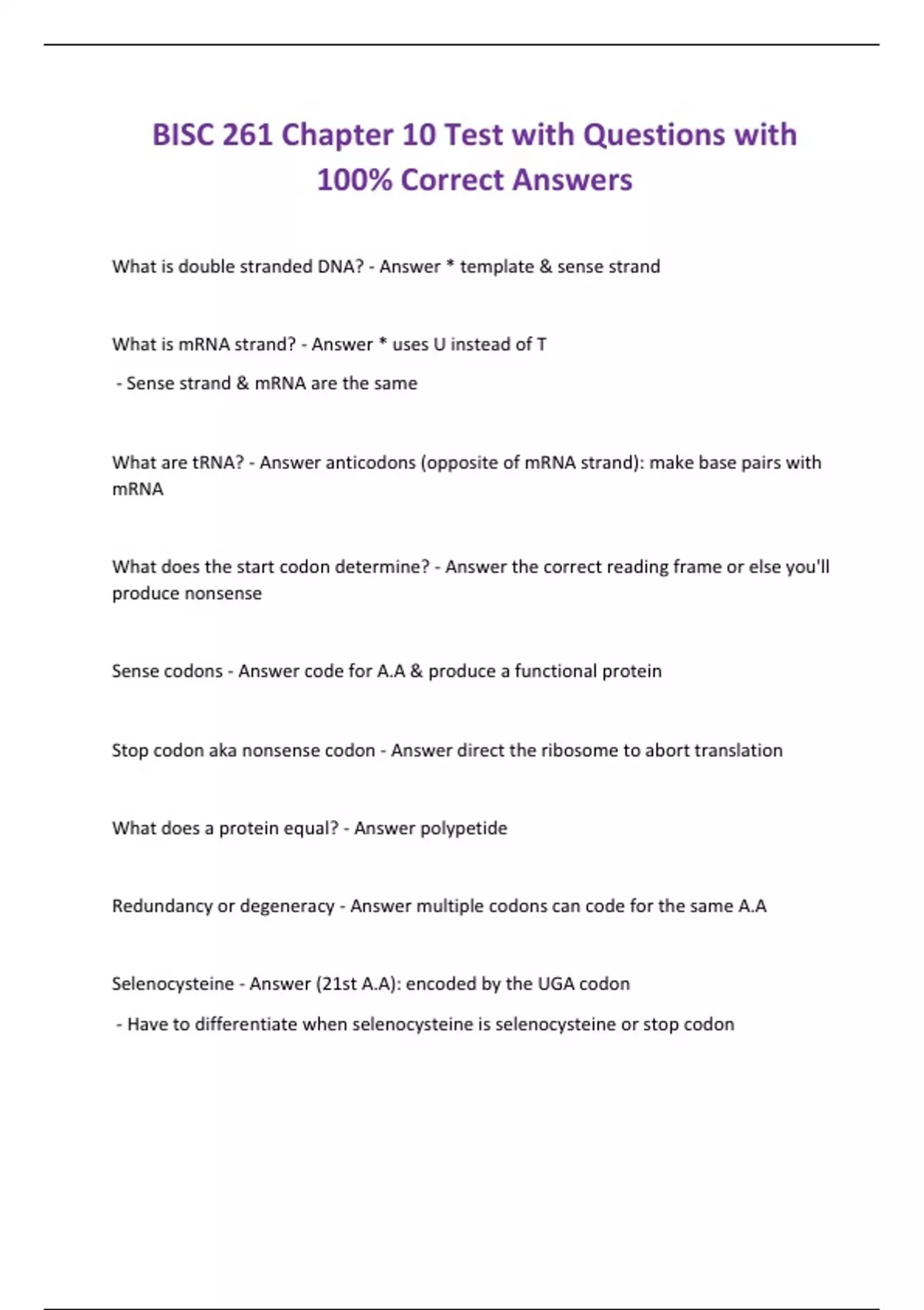 hat is double stranded DNA? - Answer * template & sense strand What is mRNA strand? - Answer * uses U instead of T - Sense strand & mRNA are the same What are tRNA? - Answer anticodons (opposite of mRNA strand): make base pairs with mRNA