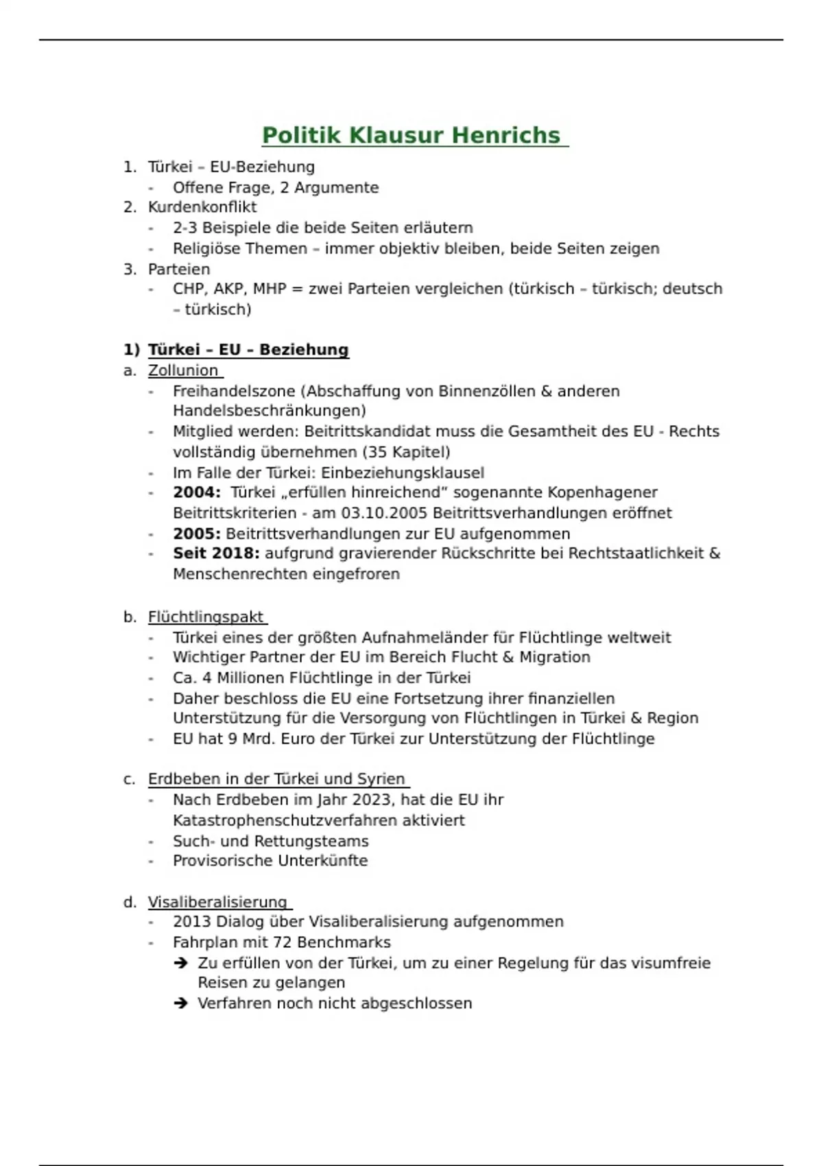 Zusammenfassung des Seminars EU und Türkei von Professor Henrichs.