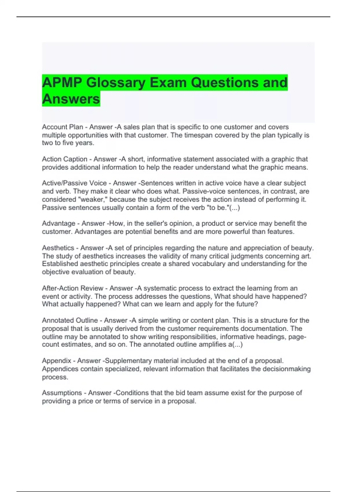 APMP Glossary Exam Questions and Answers