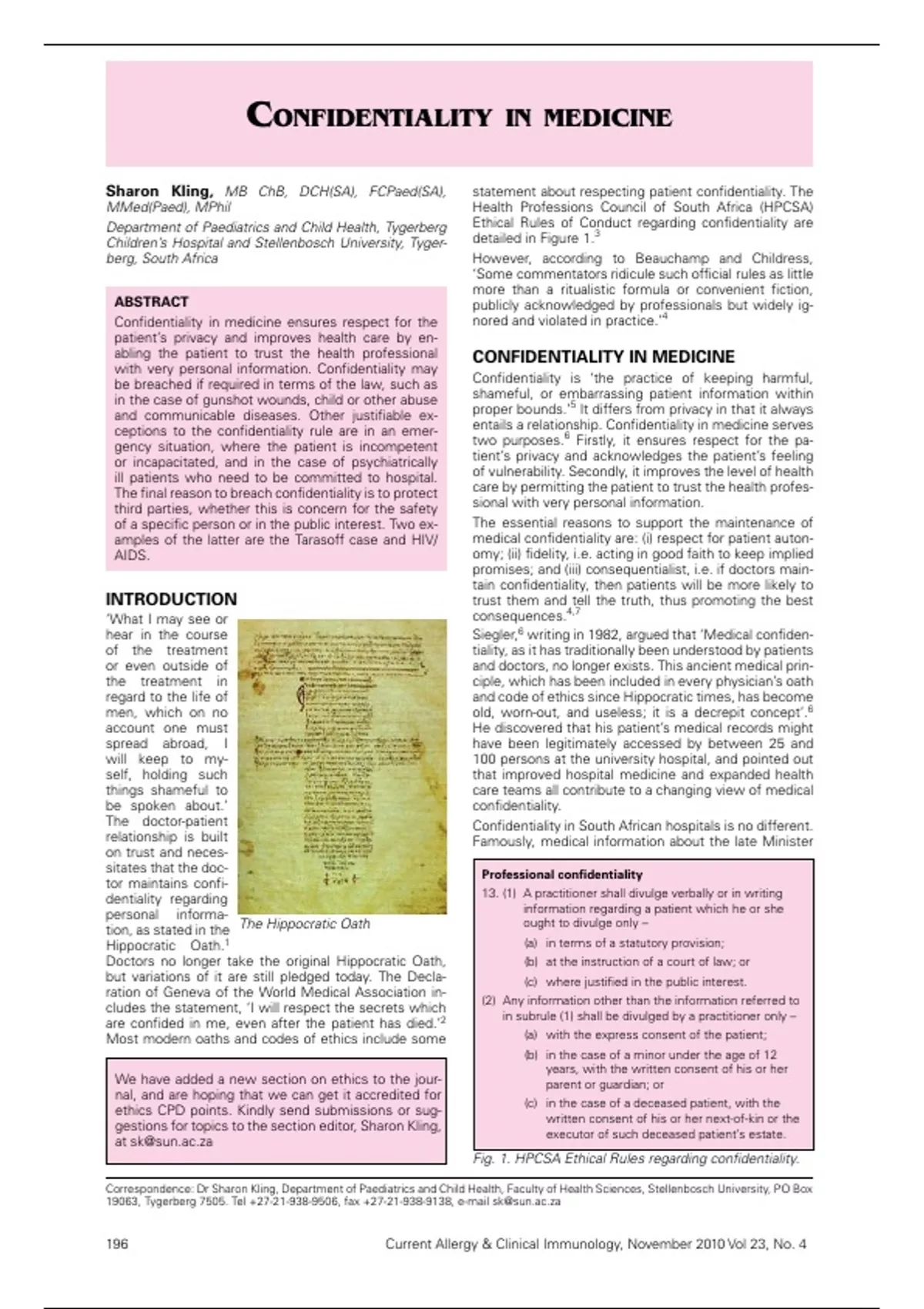 Sharon Kling, MB ChB, DCH(SA), FCPaed(SA), statement about respecting patient confidentiality. The