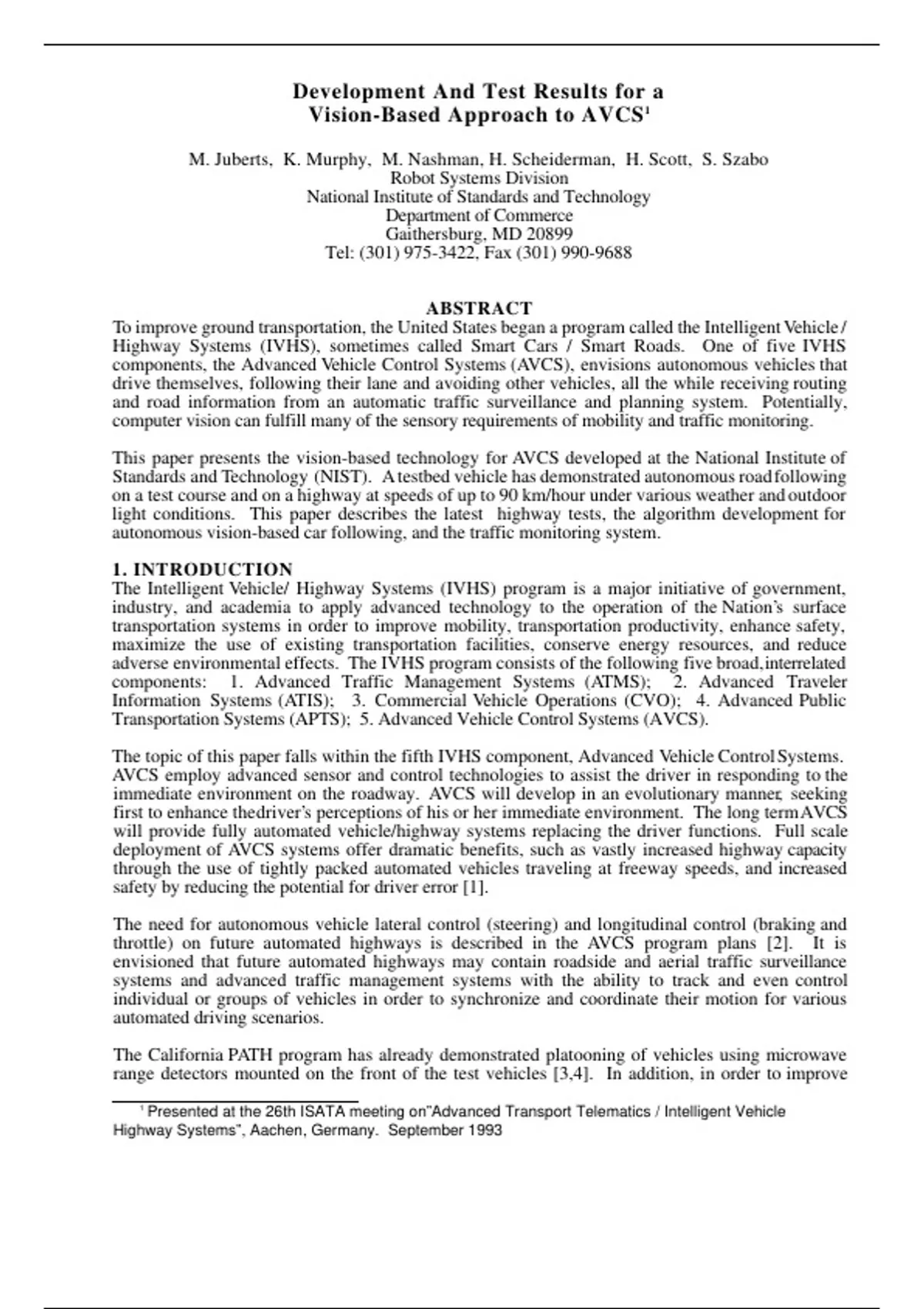 Standards and Technology (NIST). A testbed vehicle has demonstrated autonomous road following