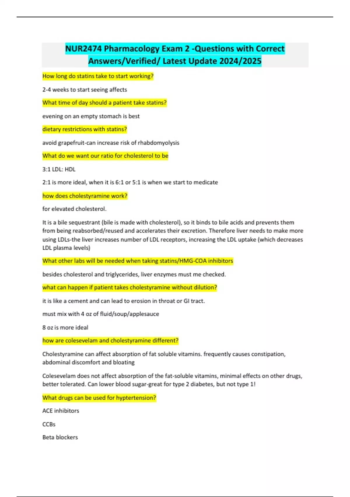 NUR2474 Pharmacology Exam 2 -Questions with Correct Answers/Verified/ Latest Update 2024/2025