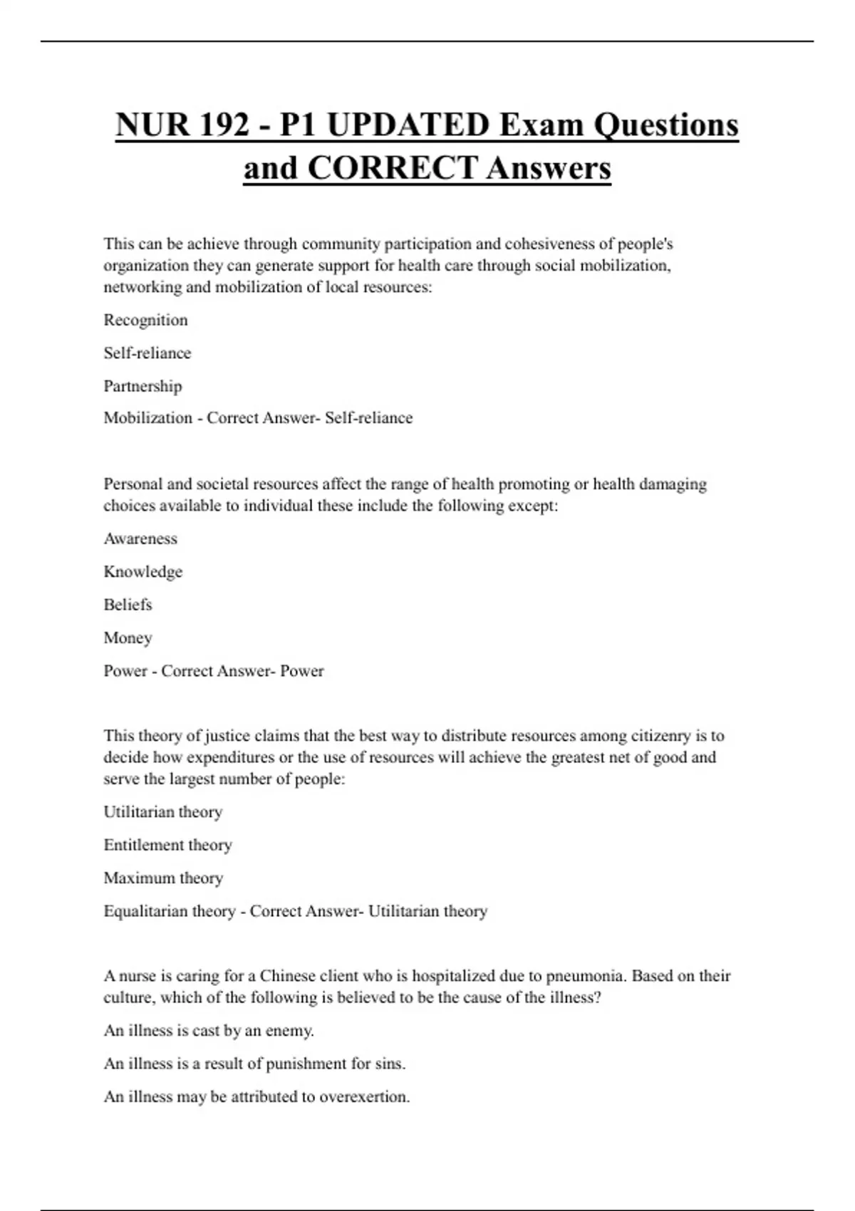 NUR 192 - P1 UPDATED Exam Questions and CORRECT Answers This can be achieve through community participation and cohesiveness of people's organization they can generate support for health care through social mobilization, networking and mobilization of local resources: Recognition Self-reliance Partnership Mobilization - Correct Answer- Self-reliance Personal and societal resources affect the range of health promoting or health damaging choices available to individual these include the following except: