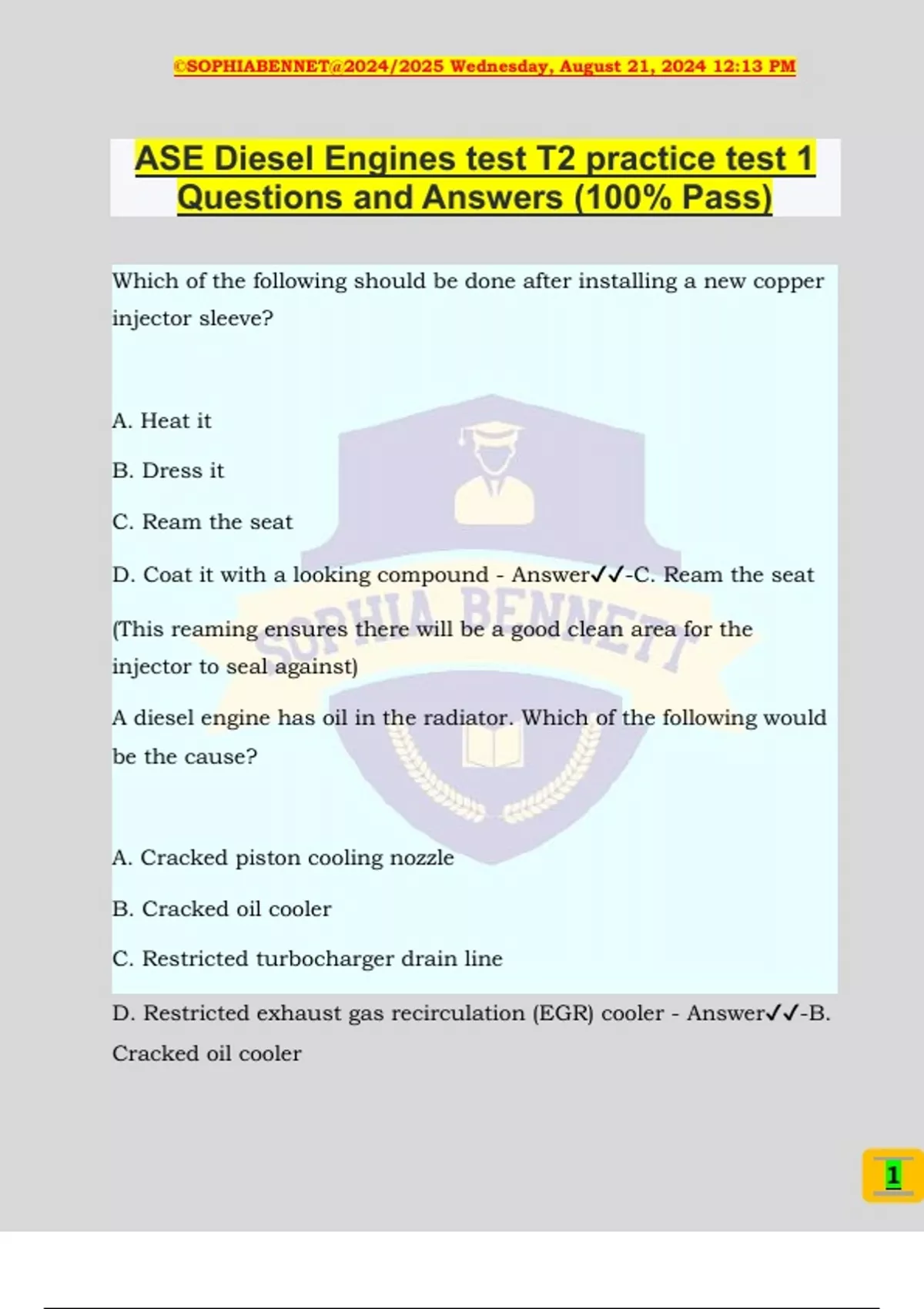 ASE Diesel Engines test T2 practice test 1 Questions and Answers (100% Pass) Which of the following should be done after installing a new copper injector sleeve? A. Heat it B. Dress it C. Ream the seat D. Coat it with a looking compound - Answer️️ -C. Ream the seat (This reaming ensures there will be a good clean area for the injector to seal against) A diesel engine has oil in the radiator. Which of the following would be the cause? A. Cracked piston cooling nozzle B. Cracked oil cooler C. Restricted turbocharger drain line D. Restricted exhaust gas recirculation (EGR) cooler - Answer️️ -B. Cracked oil cooler ©SOPHIABENNET@2024/2025 Wednesday, August 21, 2024 12:13 PM 2 ( A cracked oil cooler will allow the oil into the cooling system; thus, oil would get in the radiator.) A diesel engine has bubbles flowing in the clear bowl on the fuel/water separator. Technician A says this is caused by a restricted fuel return line. Technician B says this is caused by leaks on the return side of the fuel system. Who is correct? A. A only B. B only C. Both A and B D. Neither A nor B - Answer️️ -D. Neither A nor B (Bubbles flowing the separator indicate an air leak on the suction side of the fuel system.) A truck has been sitting for 12 hours. Which of the following open- circuit voltages would indicate a fully charged battery? A. 11.6 volts B. 12.0 volts C. 12.6 volts D. 13.0 volts - Answer️️ -C. 12.6 ©SOPHIABENNET@2024/2025 Wednesday, August 21, 2024 12:13 PM 3 (A fully charged battery should have an open-circuit voltage of 12.6 volts.) The engine oil pressure gauge fluctuates greatly. All of the following be the cause EXCEPT: A. The oil pan is overfilled B. The oil pickup tube is loose C. The wrong engine oil was installed D. The oil pressure sensor is failing - Answer️️ -C. The wrong engine oil was installed ( The incorrect oil may not provide proper lubrication, but it will NOT cause great pressure fluctuations) The engine brake will occasionally come on when pulling a hill. Technician A says the clutch switch may be faulty. Technician B says the master switch may be faulty. Who is correct? A. A only B. B only C. Both A and B D. Neither A nor B - Answer️️ -D. Neither A nor B