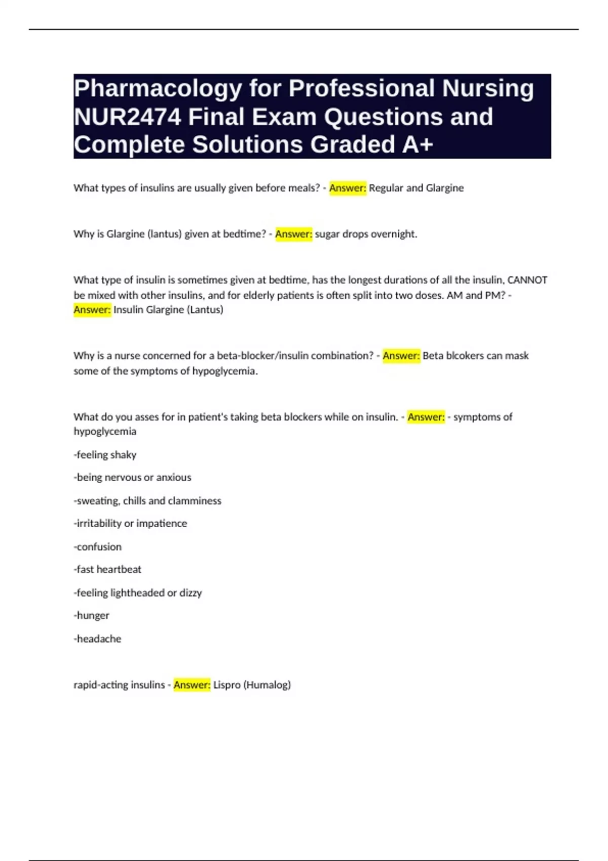 Pharmacology for Professional Nursing NUR2474 Final Exam Questions and Complete Solutions Graded A+