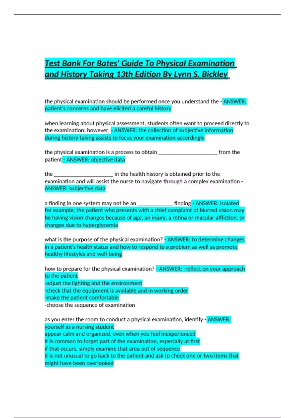 Test Bank For Bates' Guide To Physical Examination