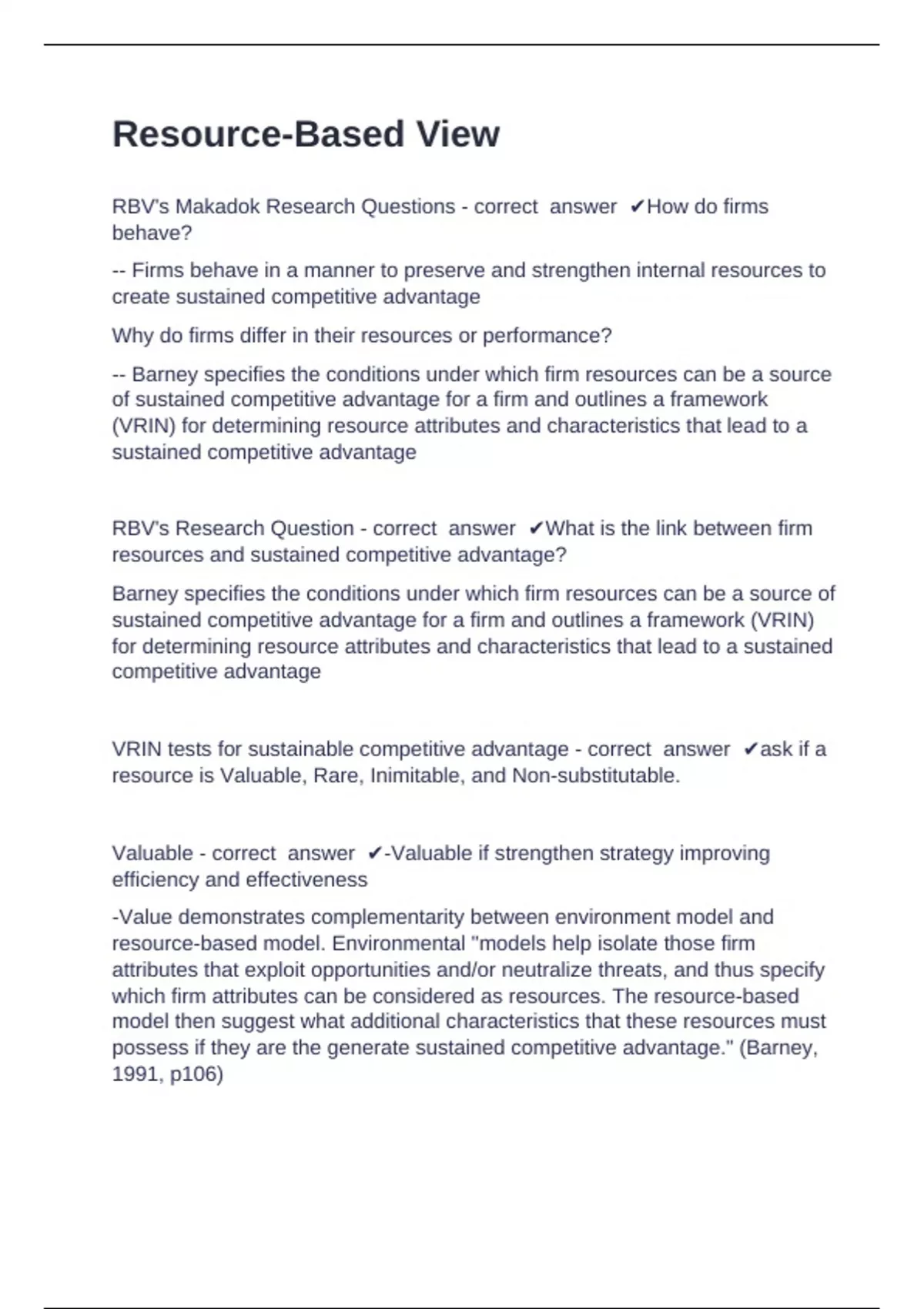 Resource Question and answers already passed 2024/2025 Resource-Based View RBV's Makadok Research Questions - correct answer How do firms behave? -- Firms behave in a manner to preserve and strengthen internal resources to create sustained competitive advantage Why do firms differ in their resources or performance? -- Barney specifies the conditions under which firm resources can be a source of sustained competitive advantage for a firm and outlines a framework (VRIN) for determining resource attributes and characteristics that lead to a sustained competitive advantage RBV's Research Question - correct answer What is the link between firm resources and sustained competitive advantage? Barney specifies the conditions under which firm resources can be a source of sustained competitive advantage for a firm and outlines a framework (VRIN) for determining resource attributes and characteristics that lead to a sustained competitive advan