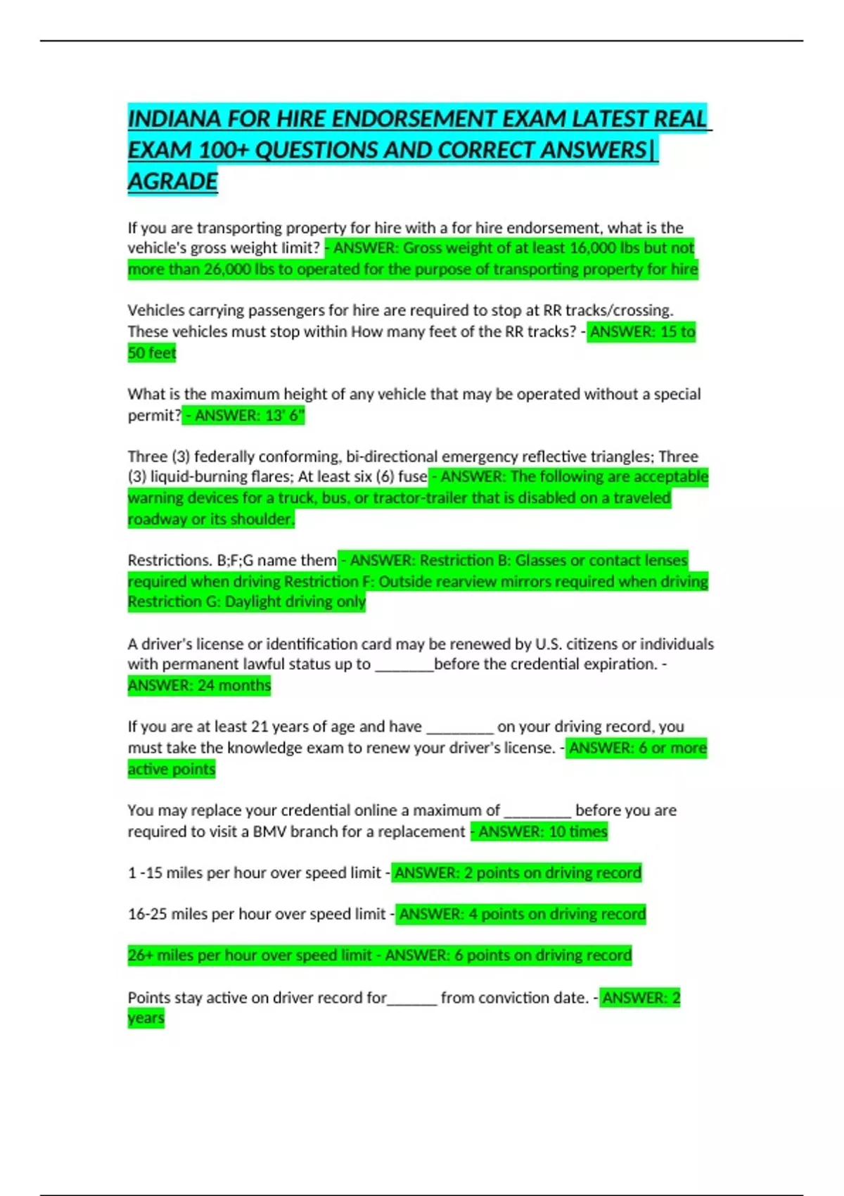 INDIANA FOR HIRE ENDORSEMENT EXAM LATEST REAL