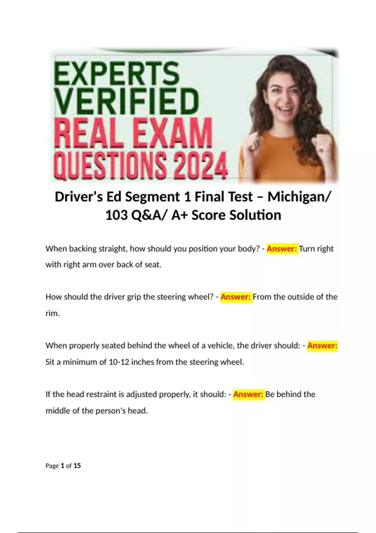Driver's Ed Segment 1 Final Test – Michigan/ 103 Q&A/ A+ Score Solution. Terms like: When backing straight, how should you position your body? - Answer: Turn right with right arm over back of seat. How should the driver grip the steering wheel? - Answer: From the outside of the rim. When properly seated behind the wheel of a vehicle, the driver should: - Answer: Sit a minimum of 10-12 inches from the steering wheel. If the head restraint is adjusted properly, it should: - Answer: Be behind the middle of the person's head.