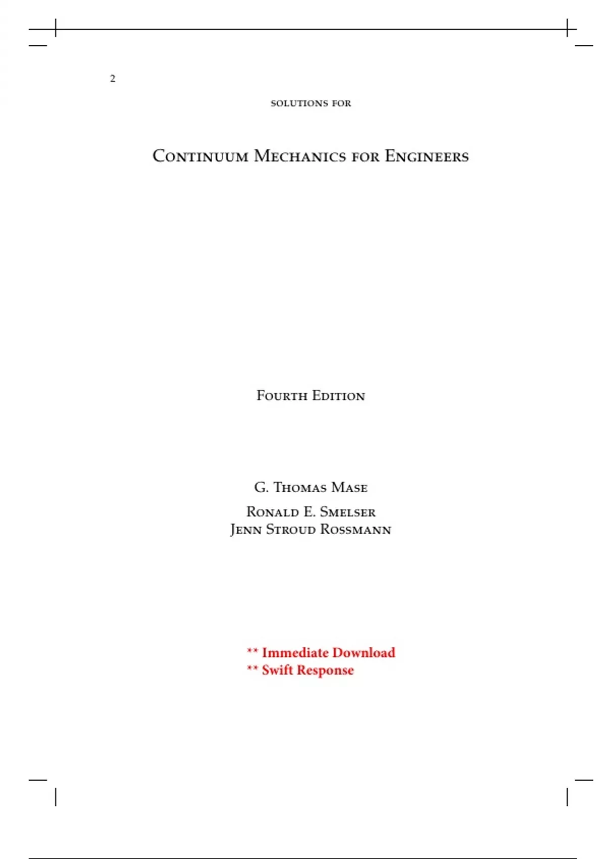 Complete Solutions Manual for Continuum Mechanics for Engineers, 4th Edition by G. Thomas Mase; Ronald E. Smelser; Jenn Stroud Rossmann ; ISBN13: 9781482238686...1.Continuum Theory. 2.Essential Mathematics. 3.Stress Principles. 4.Kinematics of Deformation and Motion. 5.Fundamental Laws and Equations. 6.Linear Elasticity. 7.Classical Fluids. 8.Nonlinear Elasticity. 9.Linear Viscoelasticity. 10.Plasticity.
