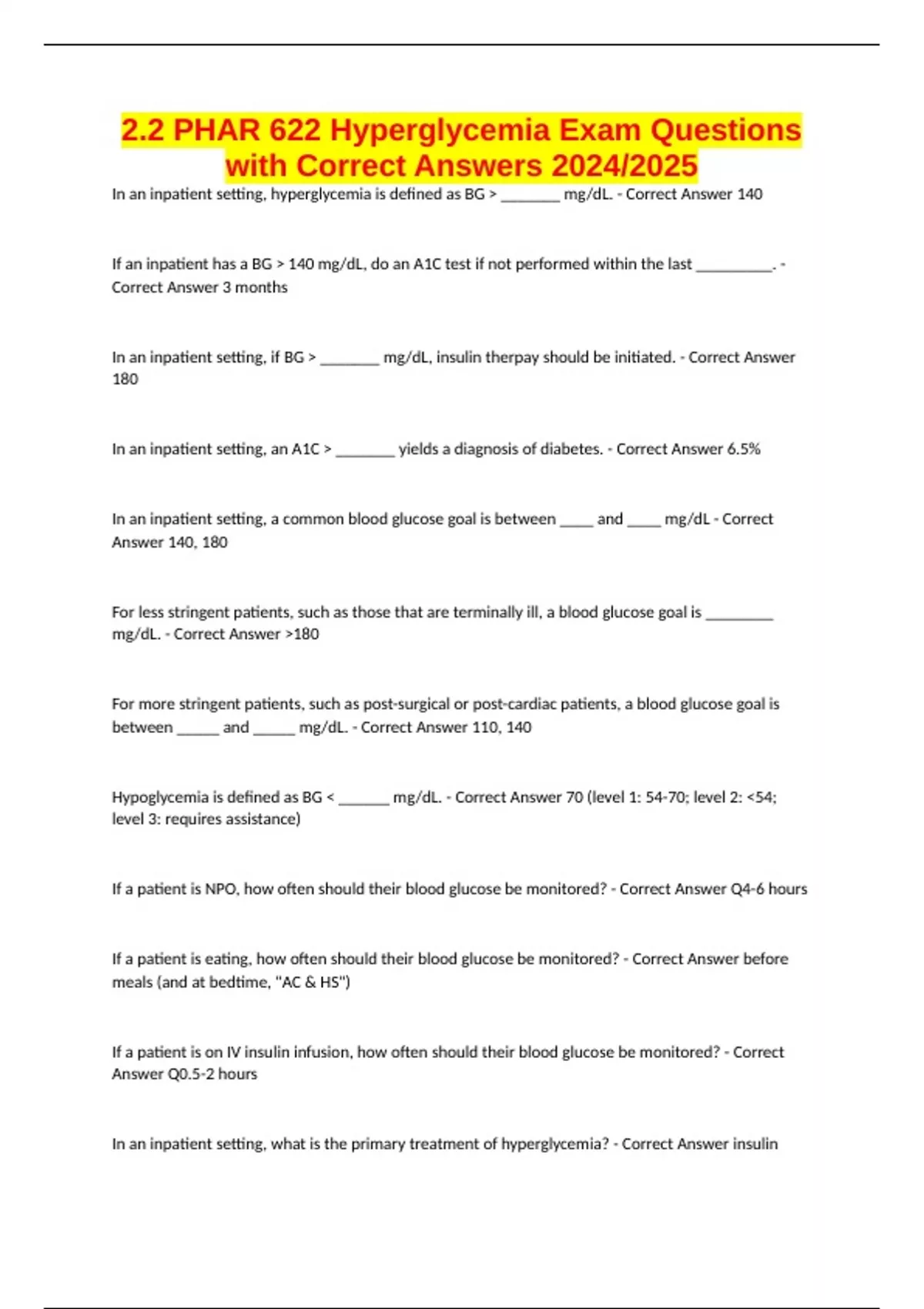 In an inpatient setting, hyperglycemia is defined as BG > _______ mg/dL. - Correct Answer 140