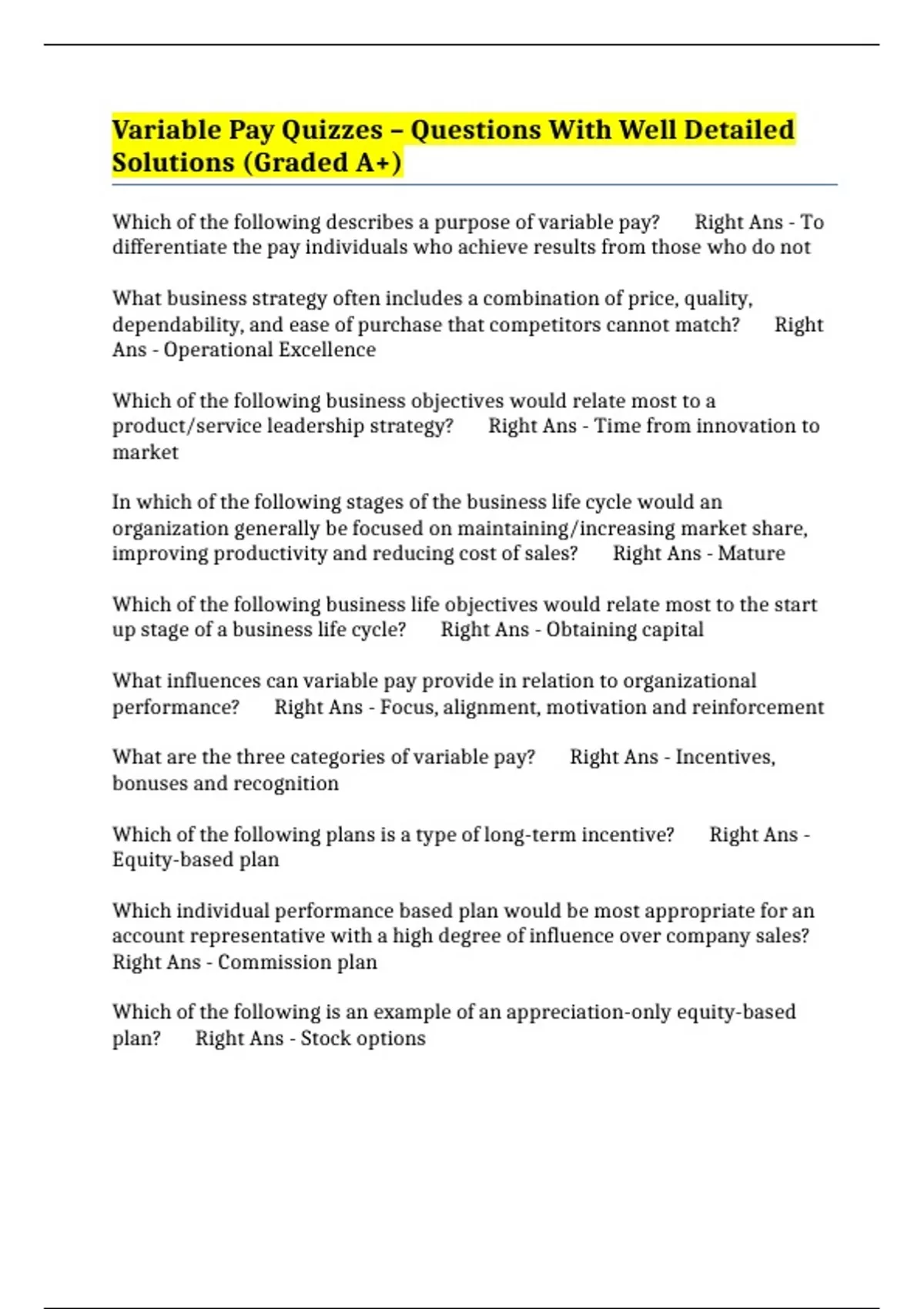 Variable Pay Quizzes – Questions With Well Detailed Solutions (Graded A+)