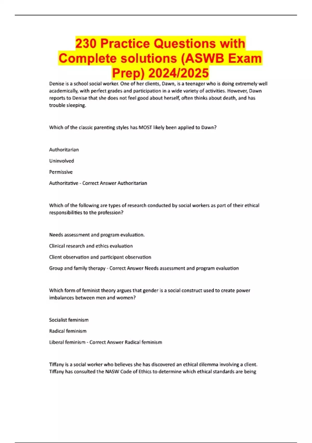 230 Practice Questions with Complete solutions (ASWB Exam Prep) 2024/2025 Denise is a school social worker. One of her clients, Dawn, is a teenager who is doing extremely well academically, with perfect grades and participation in a wide variety of activities. However, Dawn reports to Denise that she does not feel good about herself, often thinks about death, and has trouble sleeping. Which of the classic parenting styles has MOST likely been applied to Dawn? Authoritarian Uninvolved Permissive Authoritative - Correct Answer Authoritarian Which of the following are types of research conducted by social workers as part of their ethical responsibilities to the profession? Needs assessment and program evaluation. Clinical research and ethics evaluation Client observation and participant observation Group and family therapy - Correct Answer Needs assessment and program evaluation Which form of feminist theory argues that gender is a social construct used to create power imbalances between men and women? Socialist feminism Radical feminism Liberal feminism - Correct Answer Radical feminism Tiffany is a social worker who believes she has discovered an ethical dilemma involving a client. Tiffany has consulted the NASW Code of Ethics to determine which ethical standards are being compromised and what values may be at stake, and believes she has found the heart of the issue in that guidance. According to the NASW Code of Ethics, what should Tiffany do NEXT?