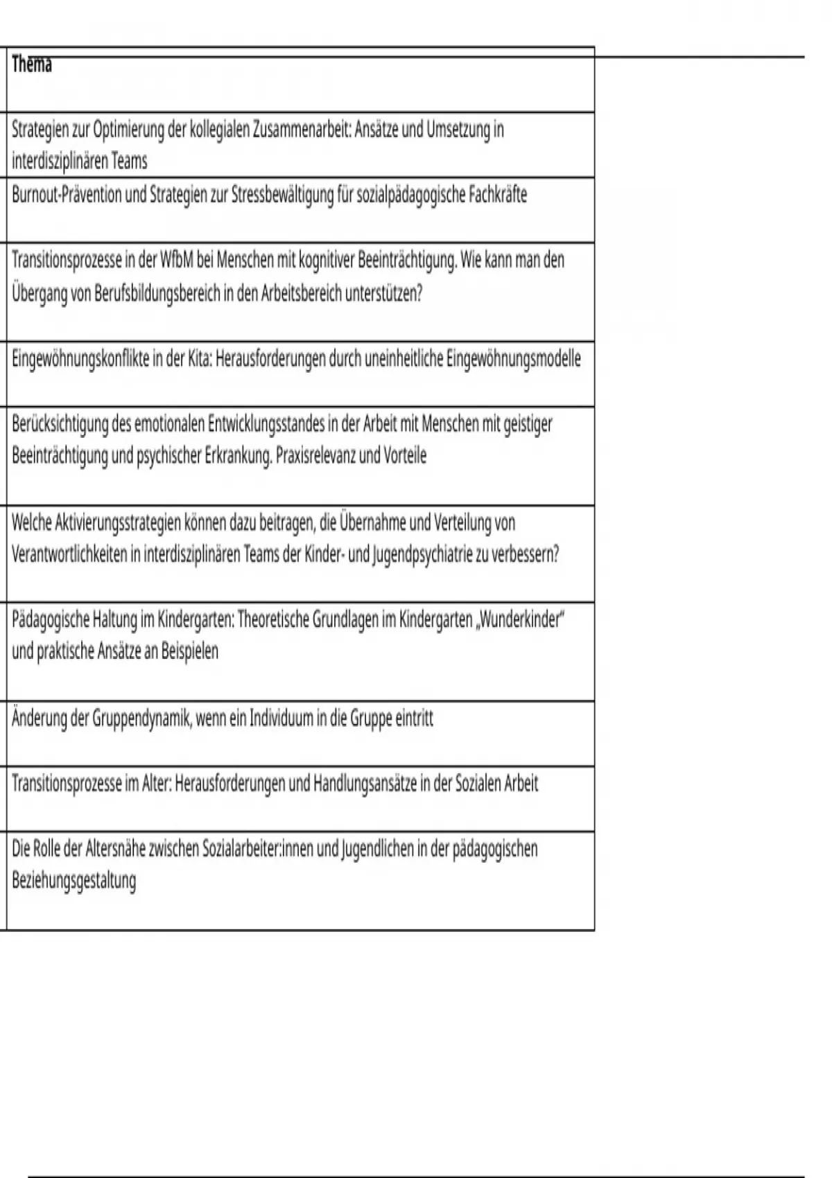 Eine Übersicht über mögliche Bachelorarbeiten oder Themen für eine Hausarbeit für die Sozialpädagogik oder Soziale Arbeit gültig.