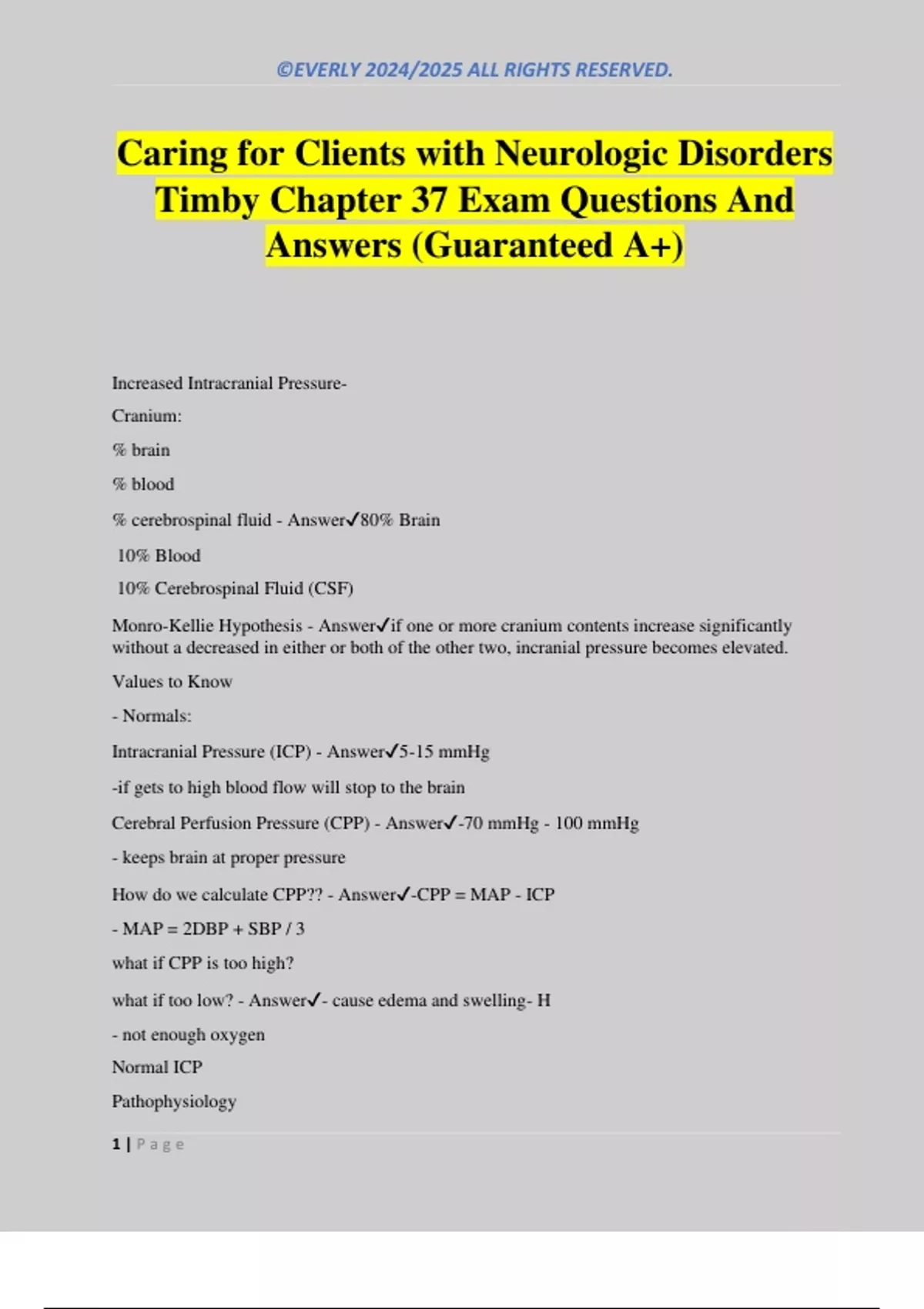 Caring for Clients with Neurologic Disorders Timby Chapter 37 Exam Questions And Answers (Guaranteed A+) Increased Intracranial Pressure- Cranium: % brain % blood % cerebrospinal fluid - Answer80% Brain 10% Blood 10% Cerebrospinal Fluid (CSF) Monro-Kellie Hypothesis - Answerif one or more cranium contents increase significantly without a decreased in either or both of the other two, incranial pressure becomes elevated. Values to Know - Normals: Intracranial Pressure (ICP) - Answer5-15 mmHg -if gets to high blood flow will stop to the brain Cerebral Perfusion Pressure (CPP) - Answer-70 mmHg - 100 mmHg - keeps brain at proper pressure How do we calculate CPP?? - Answer-CPP = MAP - ICP - MAP = 2DBP + SBP / 3 what if CPP is too high? what if too low? - Answer- cause edema and swelling- H - not enough oxygen Normal ICP Pathophysiology ©EVERLY 2024/2025 ALL RIGHTS RESERVED. 2 | P a g e - What impacts ICP? - Answer-Autoregulation - compensation: if oxygen drops then vessels in brain to dilate. if the pressure is high it will constrict. Increased ICP (IICP) -Pathophysiology - Answer-Failure of autoregulation and compensation mechanisms - Leads to herniates through foramen magnum respiration, hr, bp and the functions of descending and ascending nerve fibers affects Signs and Symptoms o Early of ICP - Answer- drowsiness, difficult to awaken - restlessness - confusion - irritability - Glasgow coma scale > 13 - personality changes - sluggish/ unequal pupil response - weakness in arm/ legs - slow/ slurred speech - dull headache, especially upon awakening - vomiting w/o nausea pupiledema: swelling of the optic nerve. pupil response is unequal. one becomes sluggishly and the other becomes fixed and dilated late signs of ICP - Answer- unresponsive - Glasgow coma <12 - decreased response to painful stimuli -decorticate or decerebrate posturing - increased weakness or hemiparesis - dilated pupil - seizures - crushing Triad: bradycardia, elevated systolic bp with wide pulse pressure, irregular breathing - loss of gag and corneal reflexes