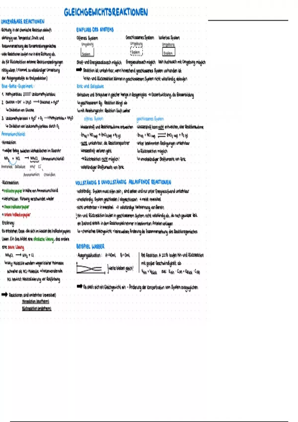 Zusammenfassung zum Thema Gleichgewichtsreaktionen, in der auf umkehrbare Reaktionen, vollständig u. unvollständig ablaufende Reaktionen, das chemische und dynamisches Gleichgewicht , die Reaktionsgeschwindigkeit, Ester, Le Chatelier, das Massenwirkungsgesetz, die Ammoniaksynthese, Katalysatoren und Säure Base eingegangen wird.