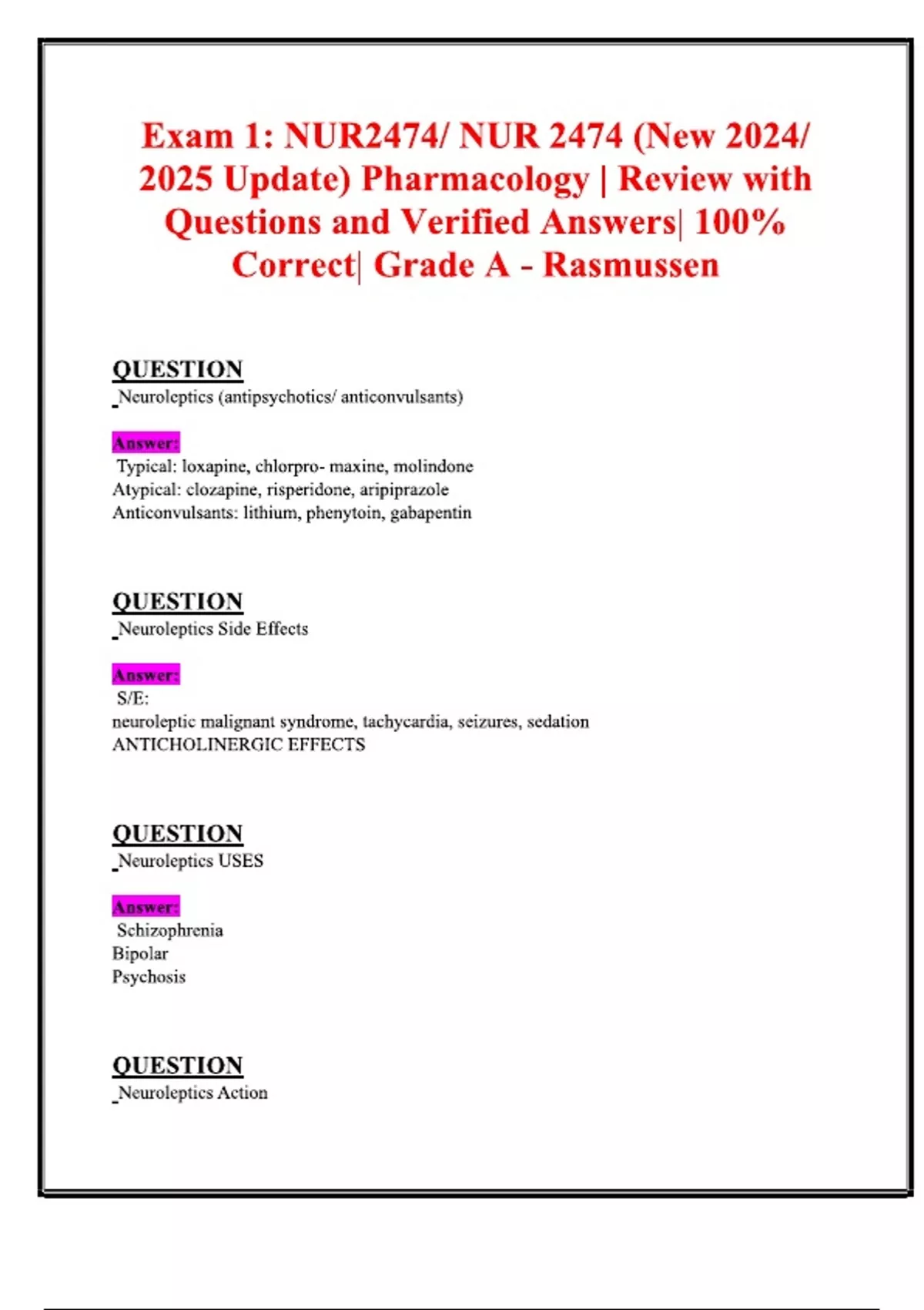 Exam 1: NUR2474/ NUR 2474 (Latest 2024/ 2025 Update) Pharmacology | Complete Review | Questions and Verified Answers| Grade A | 100% Correct