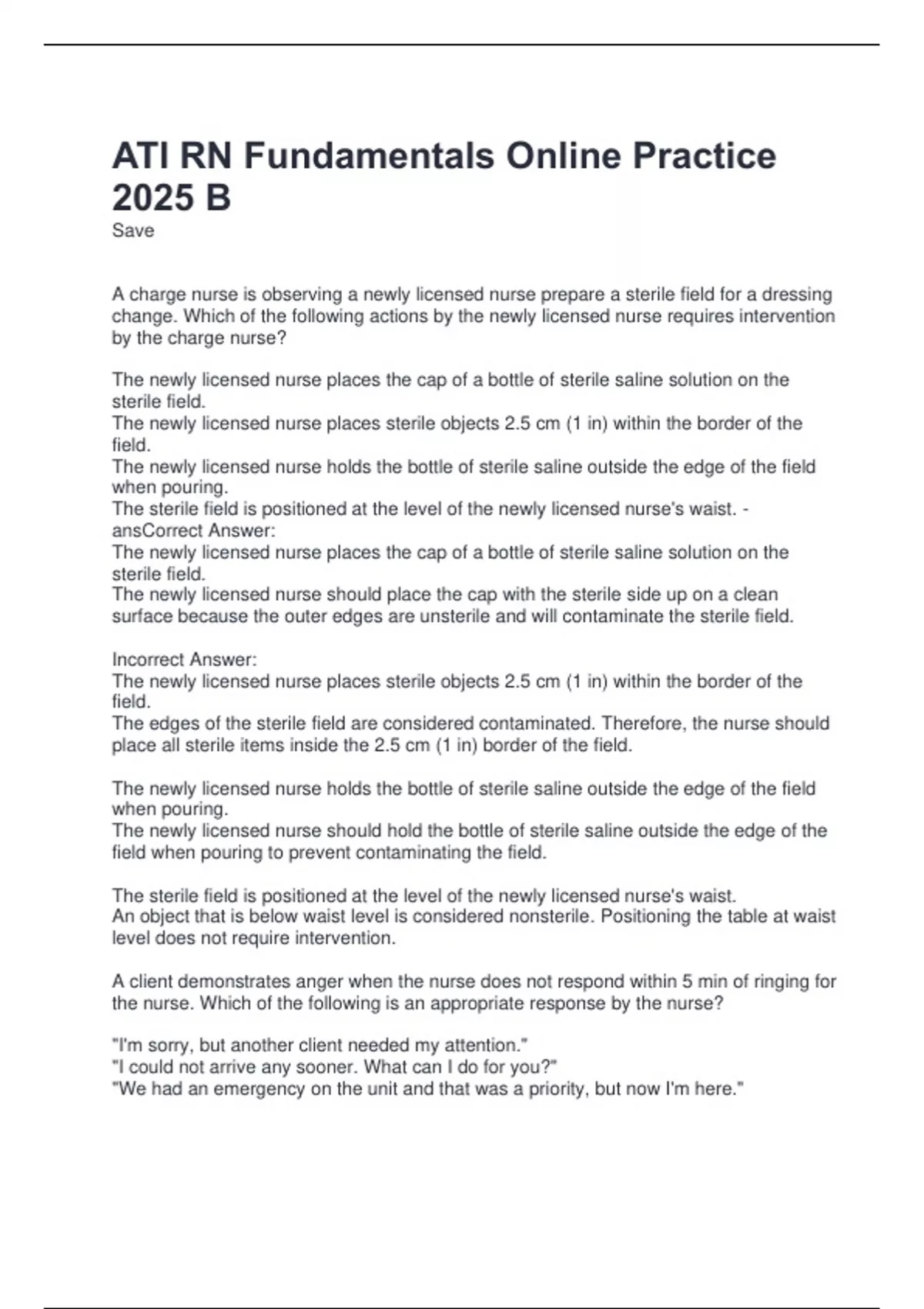 The newly licensed nurse holds the bottle of sterile saline outside the edge of the field