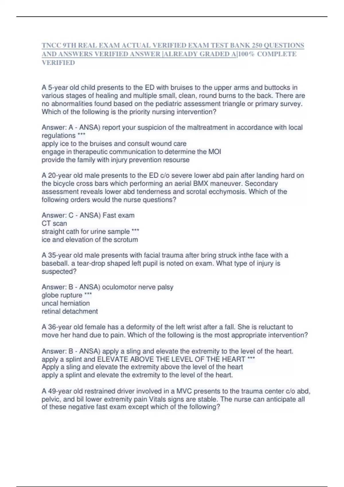 TNCC 9TH REAL EXAM ACTUAL VERIFIED EXAM TEST BANK 250 QUESTIONS AND ANSWERS