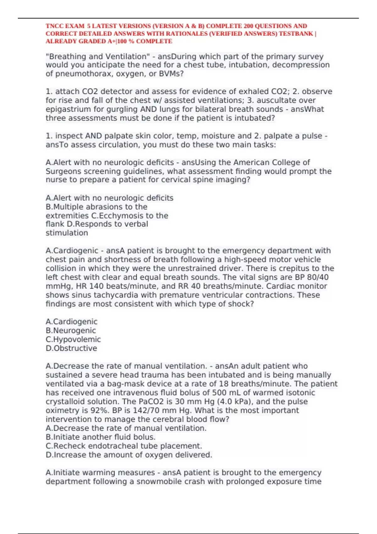 ,TNCC EXAM 5 LATEST VERSIONS (VERSION A & B) COMPLETE 200 QUESTIONS AND