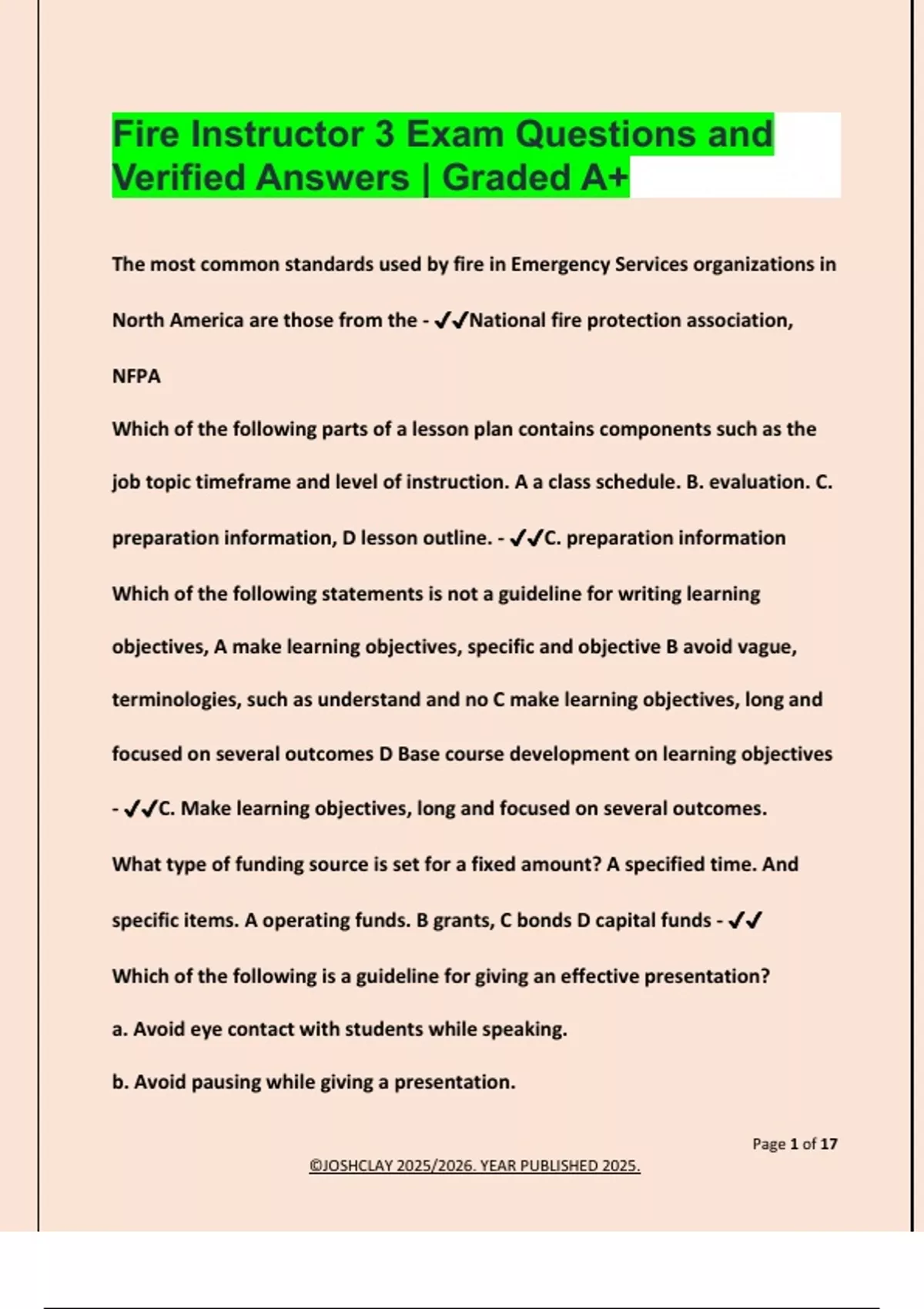 Fire Instructor 3 Exam Questions and Verified Answers | Graded A+ The most common standards used by fire in Emergency Services organizations in North America are those from the - National fire protection association, NFPA Which of the following parts of a lesson plan contains components such as the job topic timeframe and level of instruction. A a class schedule. B. evaluation. C. preparation information, D lesson outline. - C. preparation information Which of the following statements is not a guideline for writing learning objectives, A make learning objectives, specific and objective B avoid vague, terminologies, such as understand and no C make learning objectives, long and focused on several outcomes D Base course development on learning objectives - C. Make learning objectives, long and focused on several outcomes. What type of funding source is set for a fixed amount? A specified time. And specific items. A operating funds. B grants, C bonds D capital funds - Which of the following is a guideline for giving an effective presentation? a. Avoid eye contact with students while speaking. b. Avoid pausing while giving a presentation.