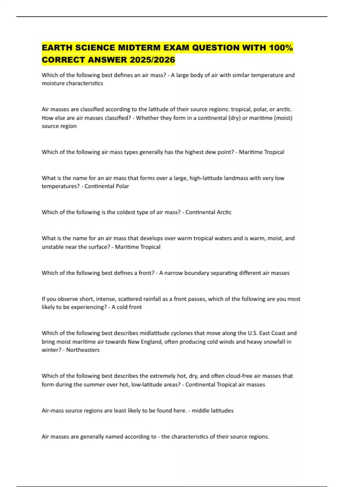 EARTH SCIENCE MIDTERM EXAM QUESTION WITH 100% CORRECT ANSWER 2025/2026 Which of the following best defines an air mass? - A large body of air with similar temperature and moisture characteristics Air masses are classified according to the latitude of their source regions: tropical, polar, or arctic. How else are air masses classified? - Whether they form in a continental (dry) or maritime (moist) source region Which of the following air mass types generally has the highest dew point? - Maritime Tropical What is the name for an air mass that forms over a large, high-latitude landmass with very low temperatures? - Continental Polar Which of the following is the coldest type of air mass? - Continental Arctic What is the name for an air mass that develops over warm tropical waters and is warm, moist, and unstable near the surface? - Maritime Tropical Which of the following best defines a front? - A narrow boundary separating different air masses If you observe short, intense, scattered rainfall as a front passes, which of the following are you most likely to be experiencing? - A cold front Which of the following best describes midlatitude cyclones that move along the U.S. East Coast and bring moist maritime air towards New England, often producing cold winds and heavy snowfall in winter? - Northeasters Which of the following best describes the extremely hot, dry, and often cloud-free air masses that