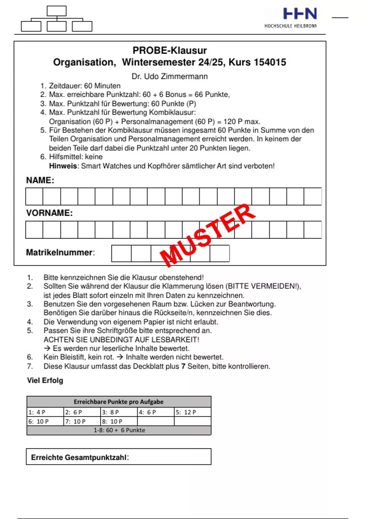Klausurformat Organisation, V1.0 – Probeklausur WS 24/25