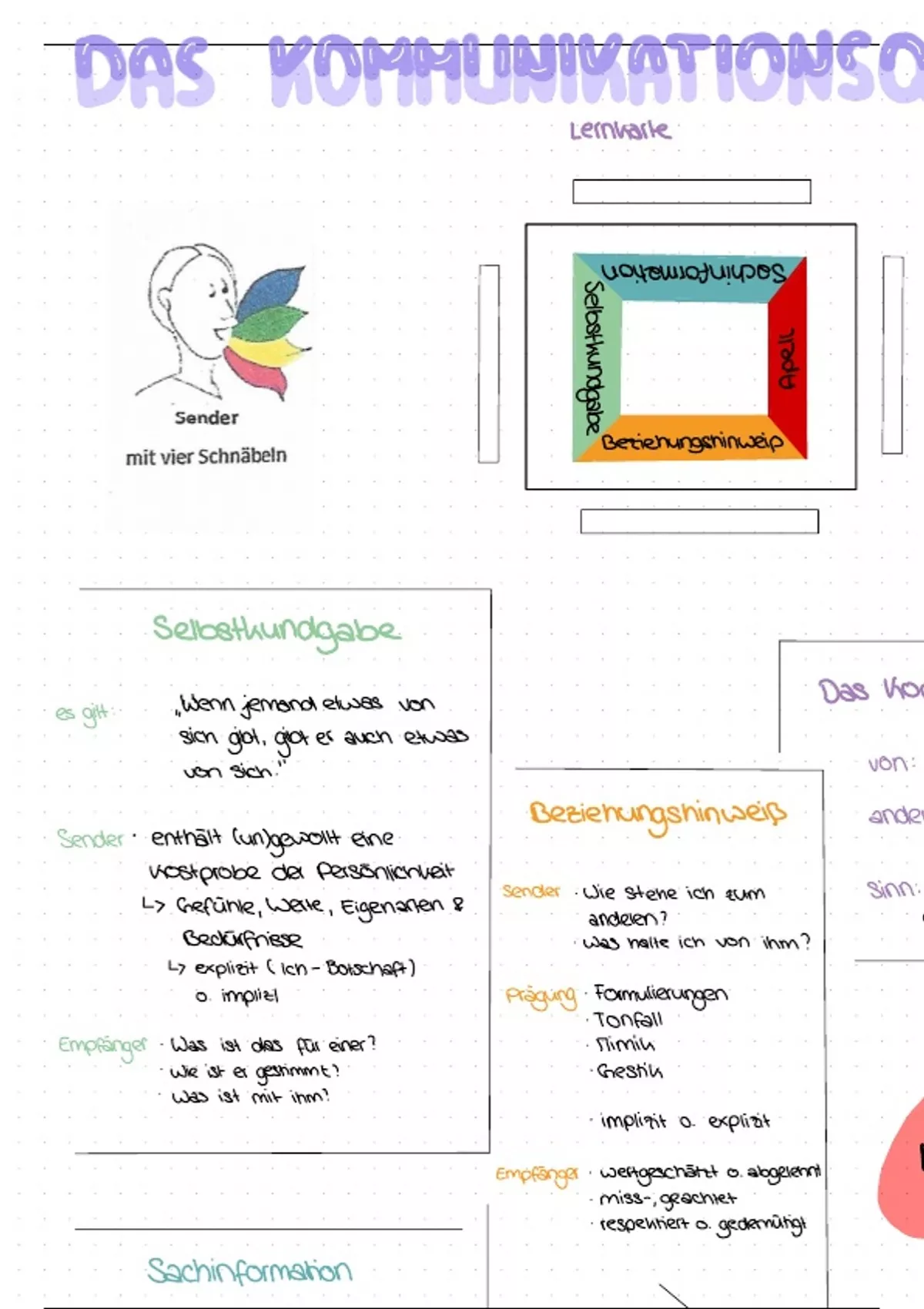 Dieses Dokument enthält eine ausführliche Analyse des Vier-Ohren-Modells von Friedemann Schulz von Thun. Es erklärt die vier Seiten einer Nachricht (Sachinhalt, Selbstkundgabe, Beziehungsebene, Appell) anhand verständlicher Beispiele. Zusätzlich werden häufige Missverständnisse in der Kommunikation beleuchtet und gezeigt, wie das Modell im Alltag angewendet werden kann. Das Material eignet sich ideal für Schüler und Studierende, die sich mit Kommunikationstheorie, Sprachpsychologie oder Rhetorik befassen.