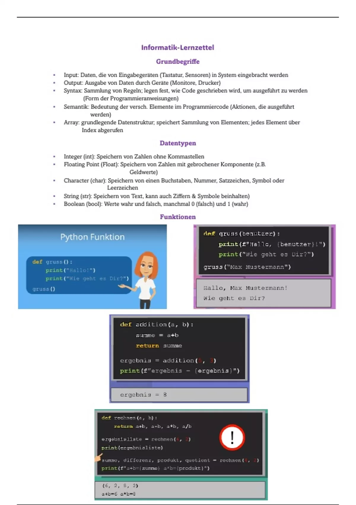 Eine Zusammenfassung für das Basisfach Informatik der 11. Klasse im ersten Halbjahr. Themen: Grundbegriffe, Datentypen, Funktionen, Schleifen, Sortierverfahren, Zeitkomplexität und Landau Notation