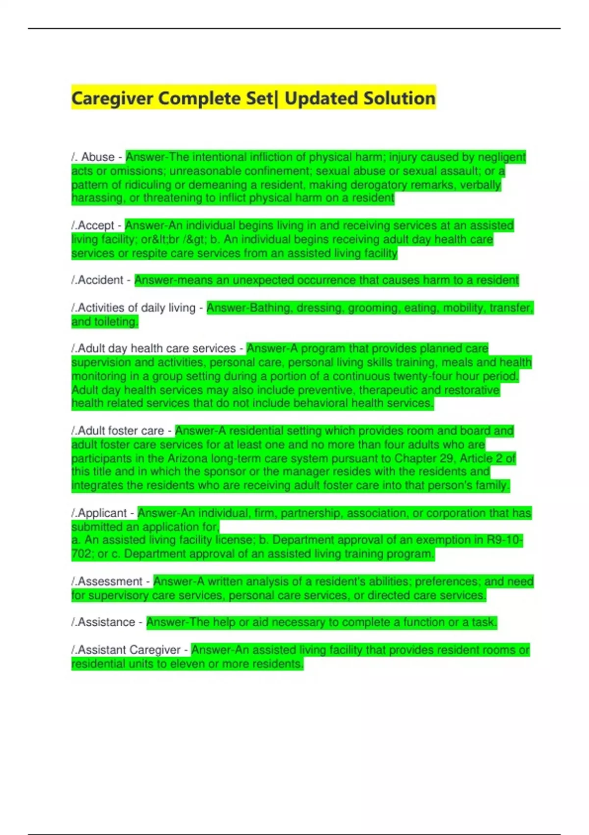 Caregiver Complete Set| Updated Solution /. Abuse - Answer-The intentional infliction of physical harm; injury caused by negligent acts or omissions; unreasonable confinement; sexual abuse or sexual assault; or a pattern of ridiculing or demeaning a resident, making derogatory remarks, verbally harassing, or threatening to inflict physical harm on a resident /.Accept - Answer-An individual begins living in and receiving services at an assisted living facility; orbr / b. An individual begins receiving adult day health care services or respite care services from an assisted living facility /.Accident - Answer-means an unexpected occurrence that causes harm to a resident /.Activities of daily living - Answer-Bathing, dressing, grooming, eating, mobility, transfer, and toileting. /.Adult day health care services - Answer-A program that provides planned care supervision and activities, personal care, personal living skills training, meals and health monitoring in a group setting during a portion of a continuous twenty-four hour period. Adult day health services may also include preventive, therapeutic and restorative health related services that do not include behavioral health services. /.Adult foster care - Answer-A residential setting which provides room and board and adult foster care services for at least one and no more than four adults who are participants in the Arizona long-term care system pursuant to Chapter 29, Article 2 of this title and in which the sponsor or the manager resides with the residents and integrates the residents who are receiving adult foster care into that person's family. /.Applicant - Answer-An individual, firm, partnership, association, or corporation that has submitted an application for, a. An assisted living facility license; b. Department approval of an exemption in R9-10-702; or c. Department approval of an assisted living training program. /.Assessment - Answer-A written analysis of a resident's abilities; preferences; and need for supervisory care services, personal care services, or directed care services. /.Assistance - Answer-The help or aid necessary to complete a function or a task. /.Assistant Caregiver - Answer-An assisted living facility that provides resident rooms or residential units to eleven or more residents. /.Assisted living facility - Answer-A residential care institution, including adult foster care, that provides or contracts to provide supervisory care services, personal care services or directed care services on a continuing basis. /.Assisted living home - Answer-An assisted living facility that provides resident rooms to ten or fewer residents. /.Bathing - Answer-Washing, rinsing, and drying all parts of an individual's body. /.Bedbound - Answer-Confined to a bed or chair because of an inability to ambulate even with assistance. /.Bedroom - Answer-A portion of a facility that is wall-enclosed with a door where a resident sleeps and maintains personal items. /.Behavioral health residential services - Answer-A therapeutic regimen of screening, evaluation, treatment, or rehabilitation provided on a 24-hour basis to individuals suffering from mental disorders, emotional conditions, or the effects of substance abuse. /.Board of Examiners - Answer-The Board of Examiners of Nursing Care Institution Administrators and Assisted Living Facility Managers. /.Caregiver - Answer-An individual who provides supervisory care services, personal care services, or directed care services to residents. /.Charge - Answer-A one-time payment or a payment that is not incurred in fixed, regular intervals. /.chemical restraint - Answer-Any medication that is administered for purposes of discipline or convenience and is not required to treat a resident's medical symptoms /.Clean - Answer-Free of dirt or debris by such methods as washing with soap and water, vacuuming, wiping, dusting, or sweeping /.communicable disease - Answer-An infectious disease transmissible (as from person to person) by direct contact with an affected individual or the individual's discharges or by indirect means (as by a vector) The same as defined in A.A.C. R9-6-10. /.conspicuously posted - Answer-Placed at a location within a facility that is accessible and visible to residents and the public /.continuous - Answer-Available at all times without cessation, break, or interruption. 27. "CPR" means cardiopulmonary