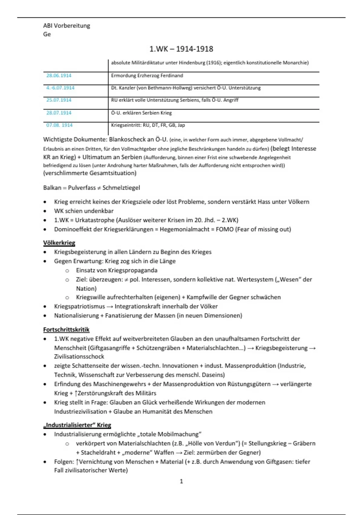 • 1.WK = Urkatastrophe (Auslöser weiterer Krisen im 20. Jhd. – 2.WK)