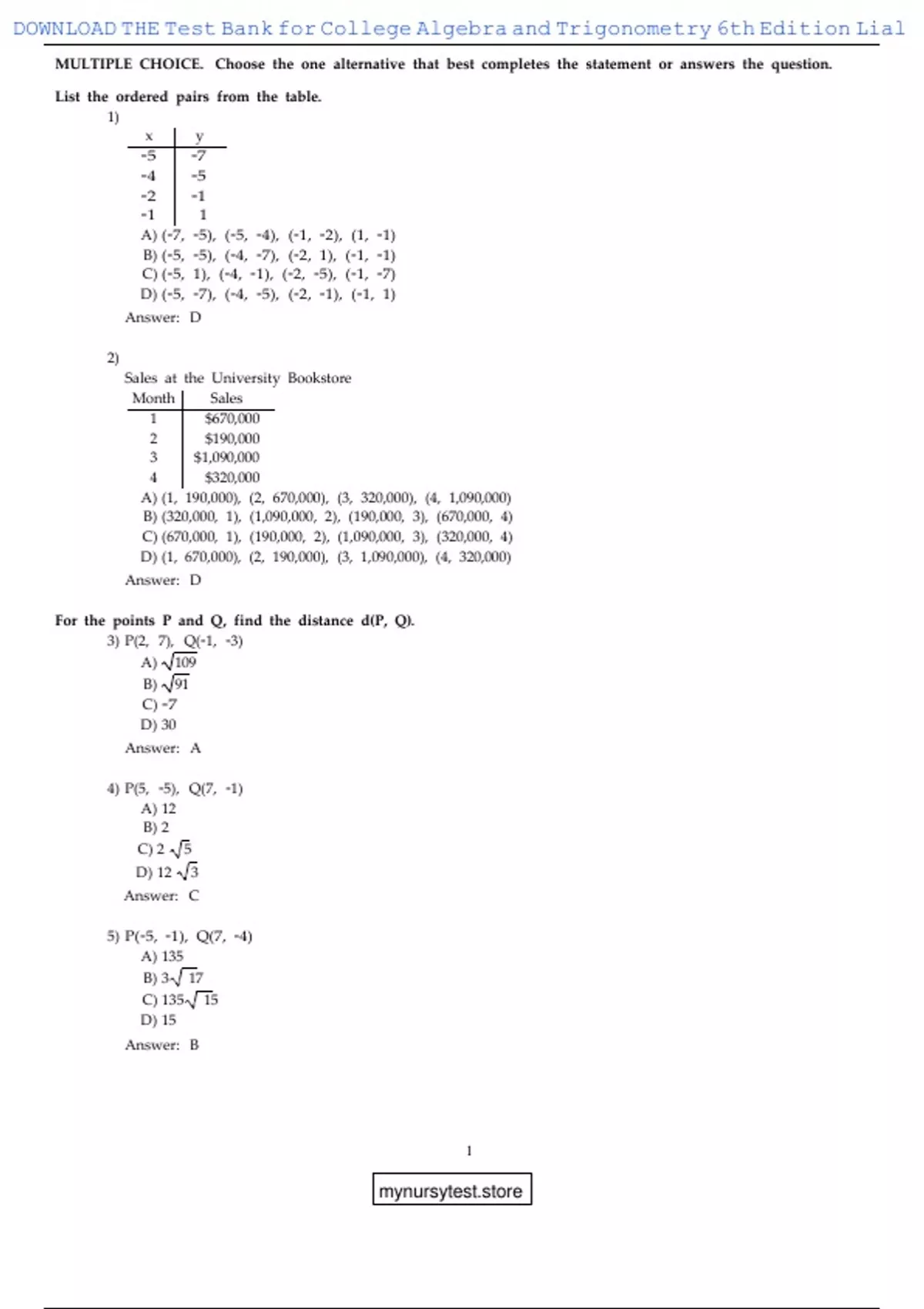 , DOWNLOAD THE Test Bank for College Algebra and Trigonometry 6th Edition Lial