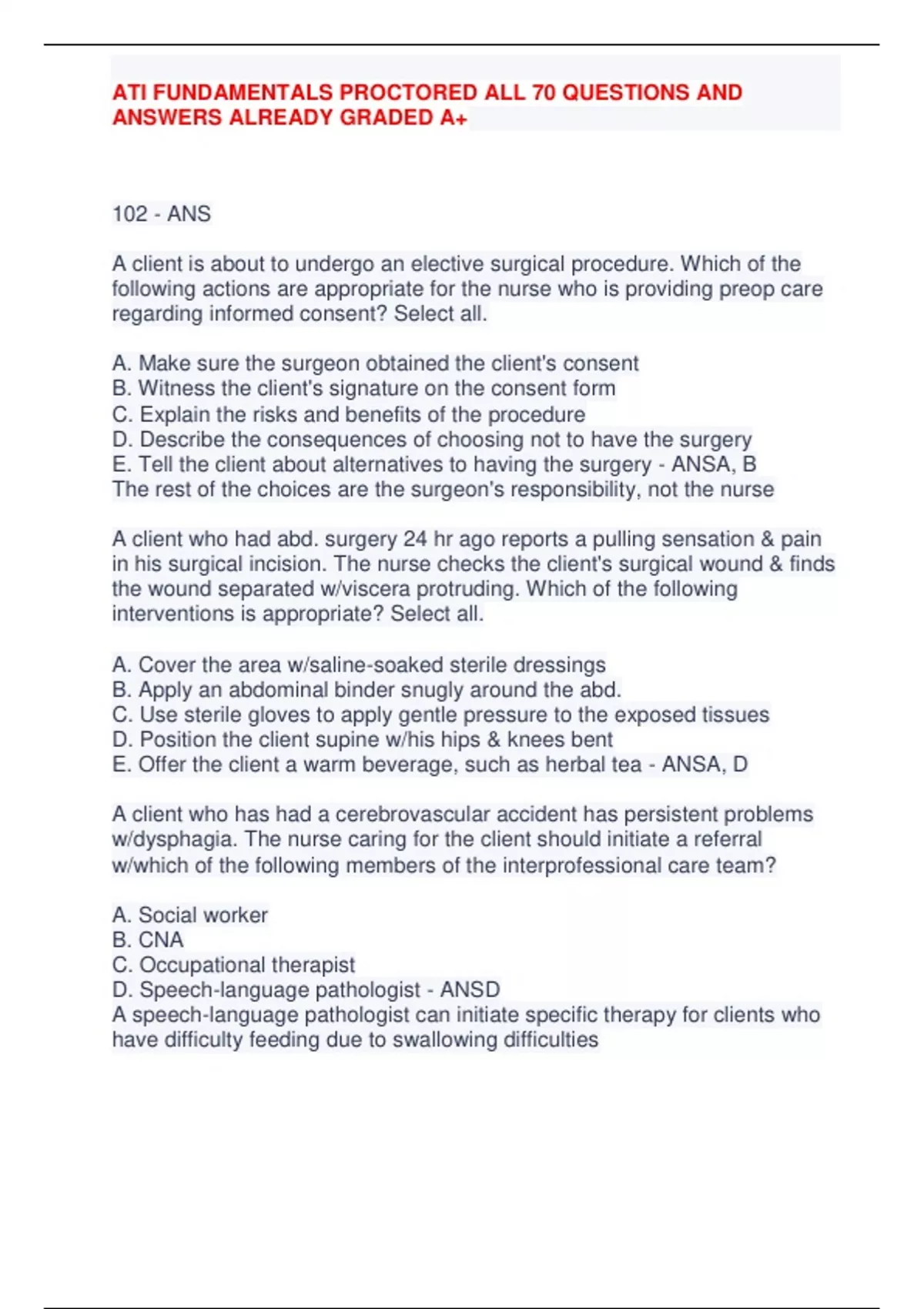 , ATI FUNDAMENTALS PROCTORED ALL 70 QUESTIONS AND