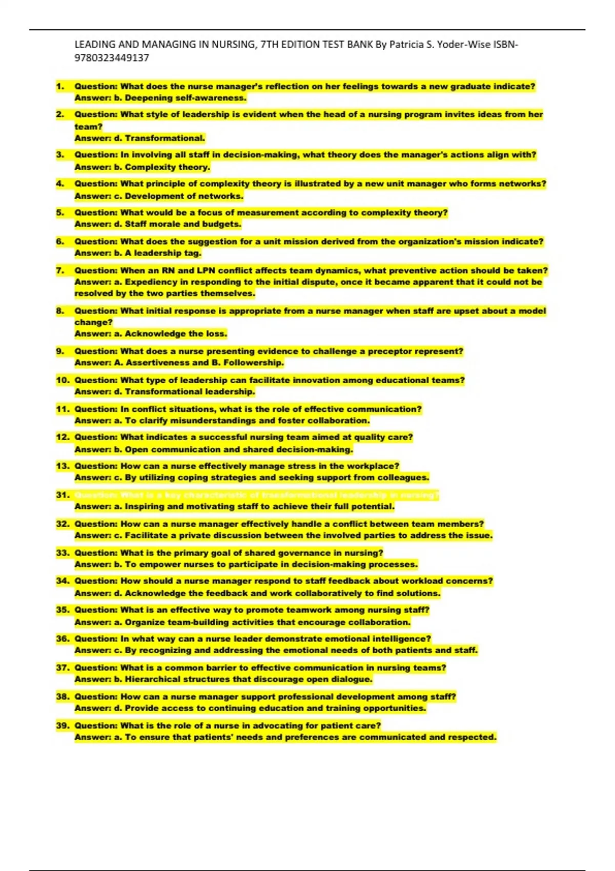 , LEADING AND MANAGING IN NURSING, 7TH EDITION TEST BANK By Patricia S. Yoder-Wise ISBN-