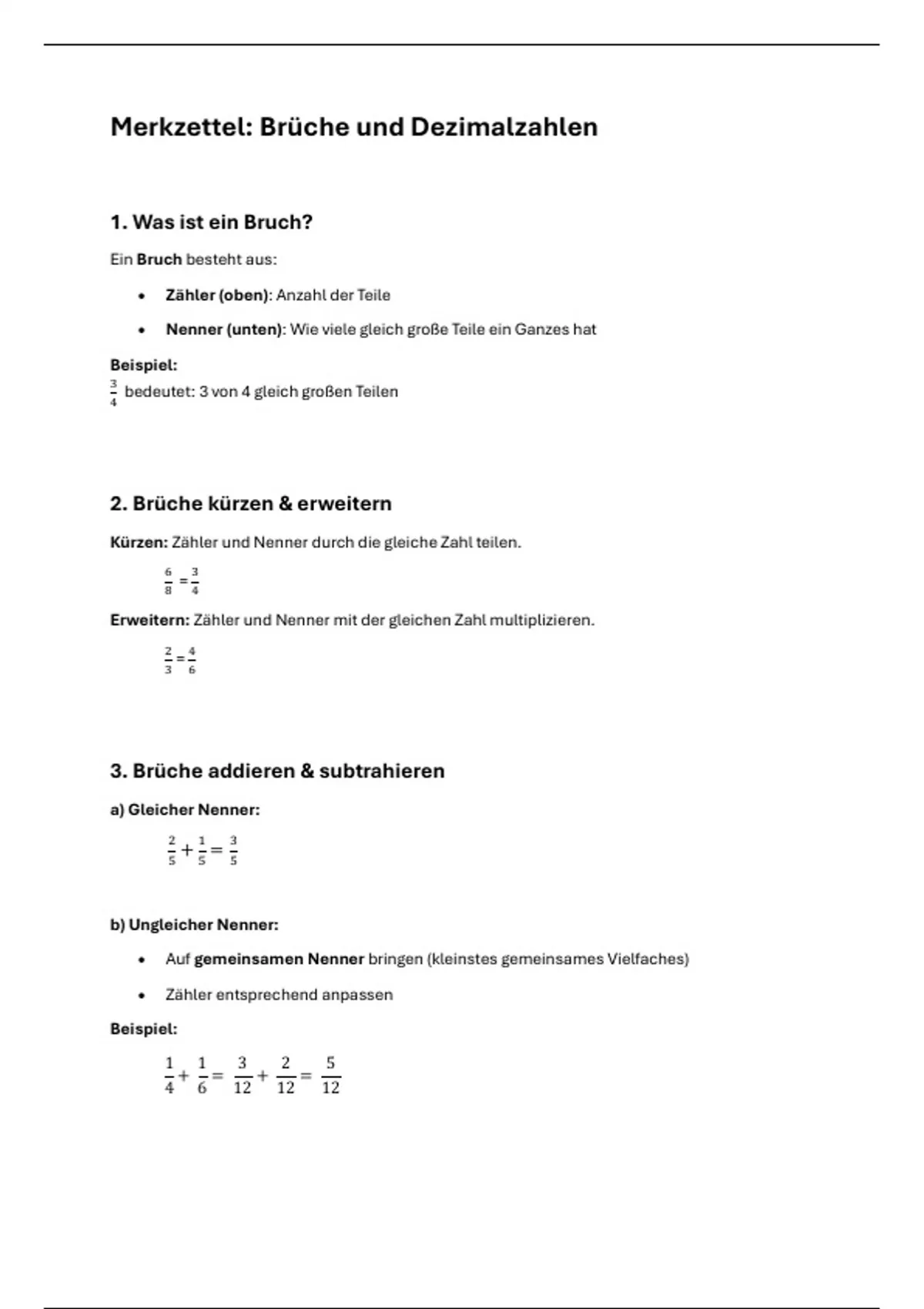 Merkzettel: Brüche und Dezimalzahlen
