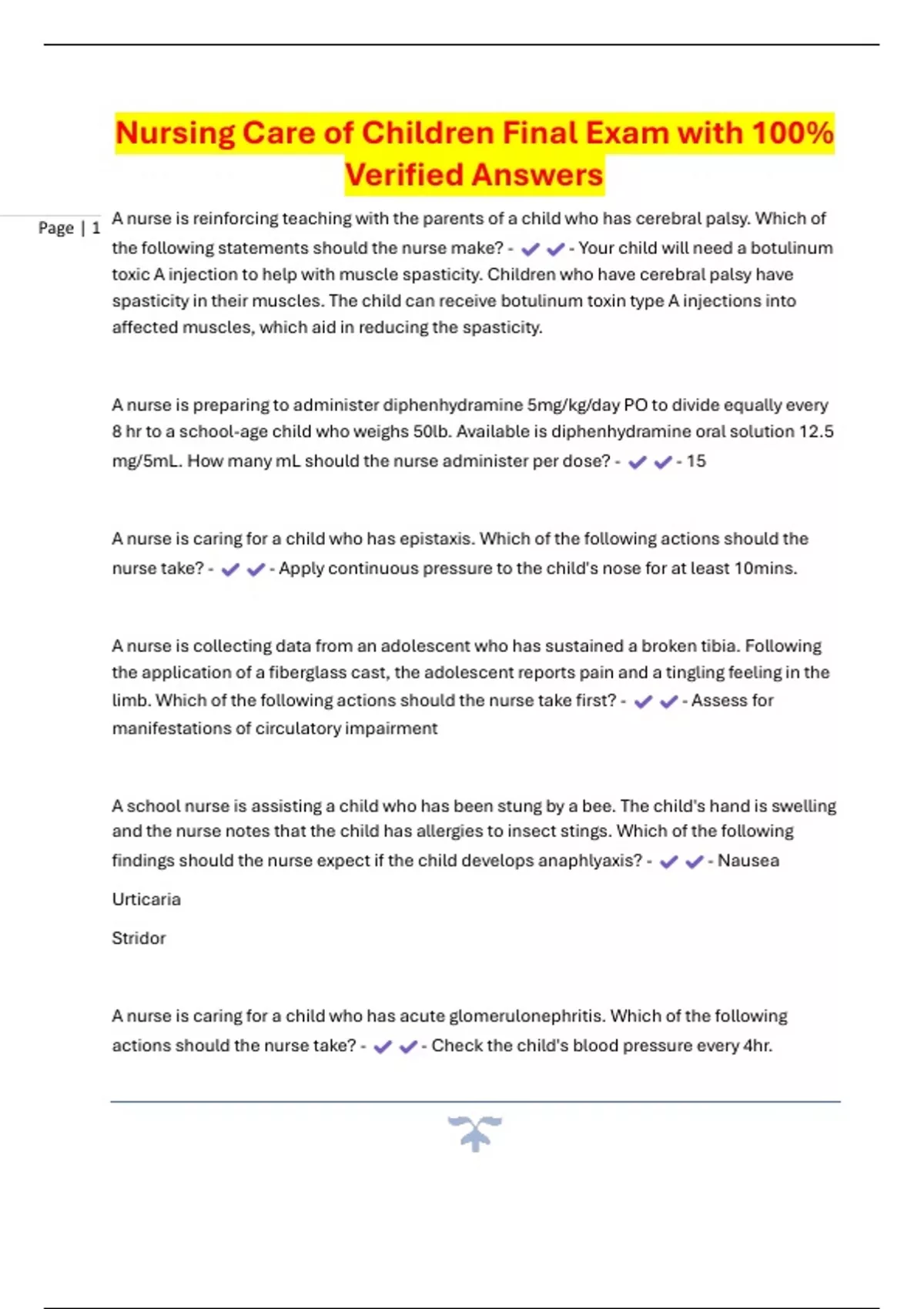 Page | 1 A nurse is reinforcing teaching with the parents of a child who has cerebral palsy. Which of