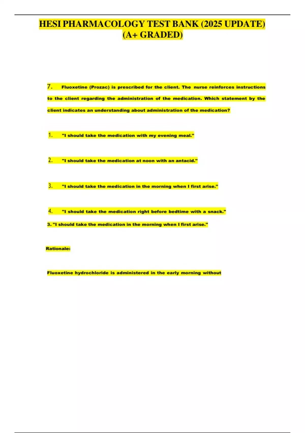 7. Fluoxetine (Prozac) is prescribed for the client. The nurse reinforces instructions