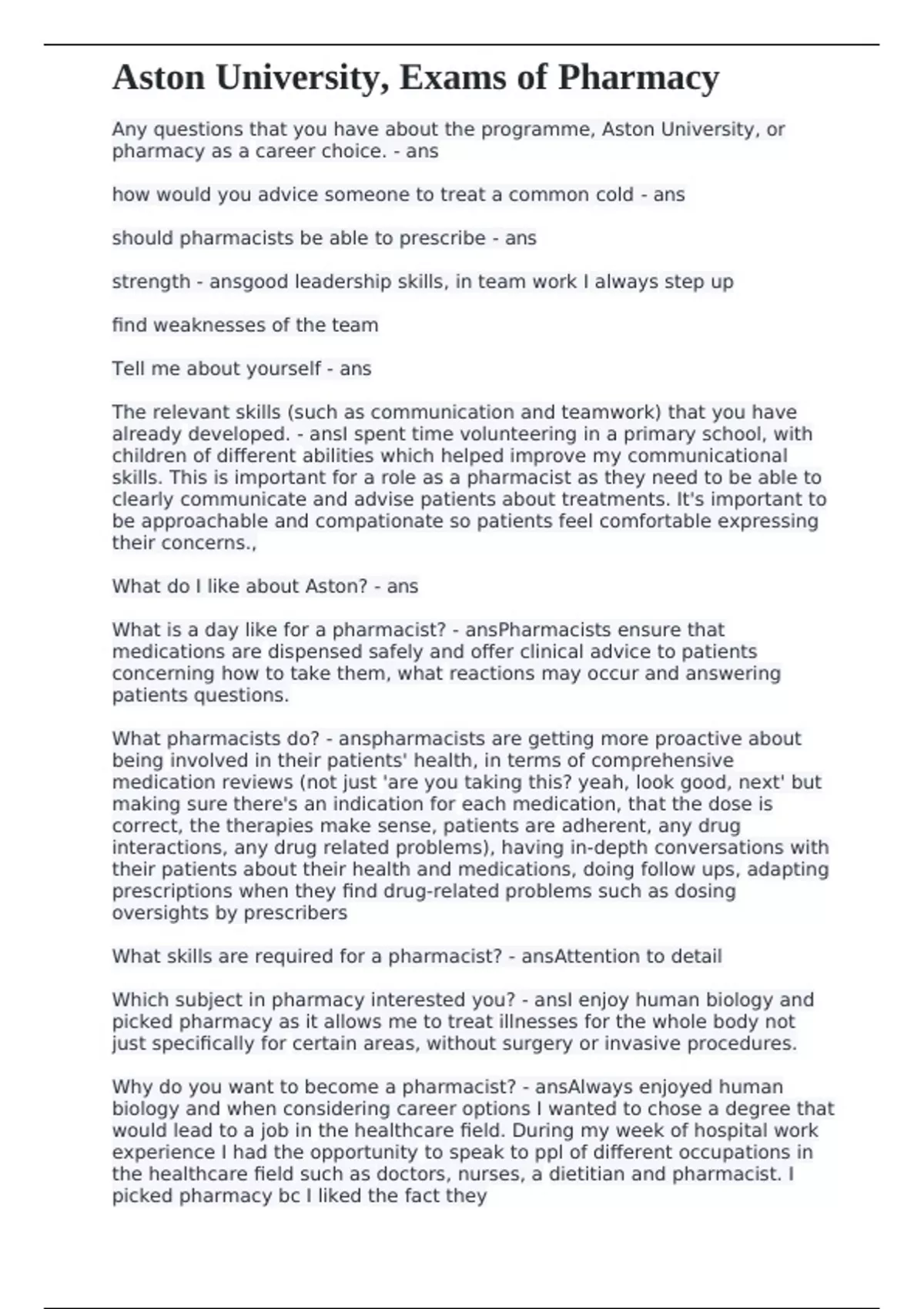Aston University, or pharmacy as a career choice. - ans