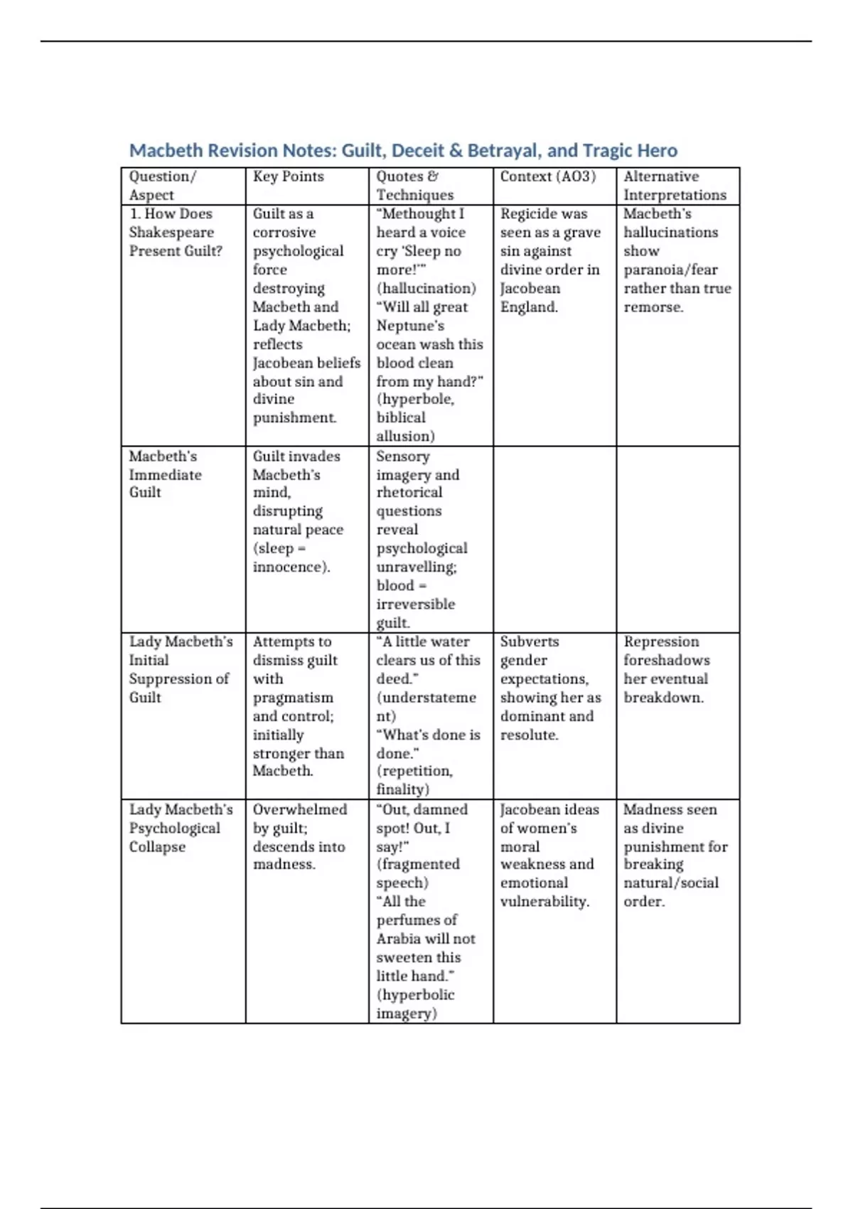 Macbeth Revision Notes: Guilt, Deceit & Betrayal, and Tragic Hero