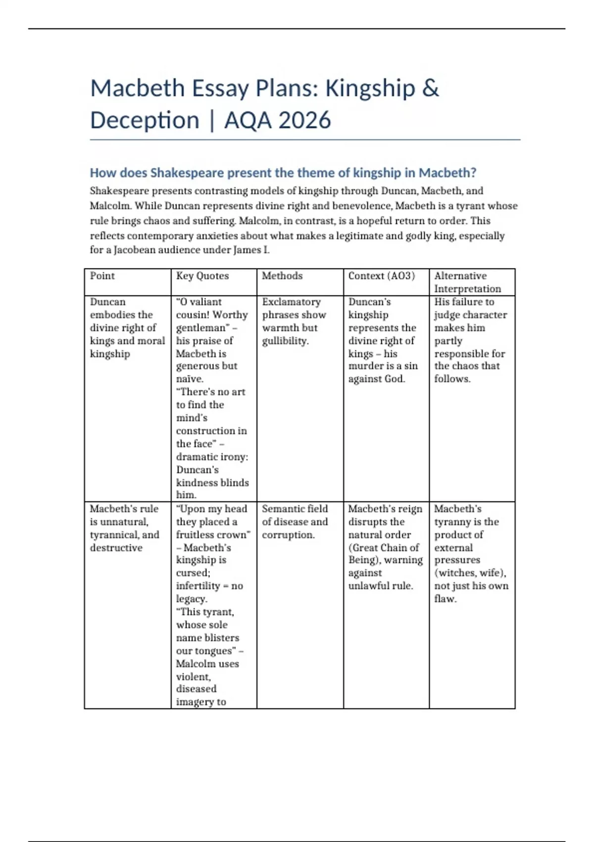 Macbeth Essay Plans: Kingship &
