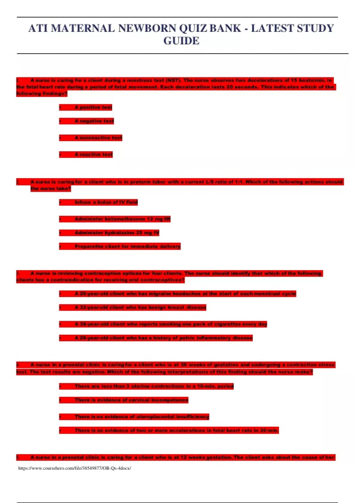 , ATI MATERNAL NEWBORN QUIZ BANK - LATEST STUDY