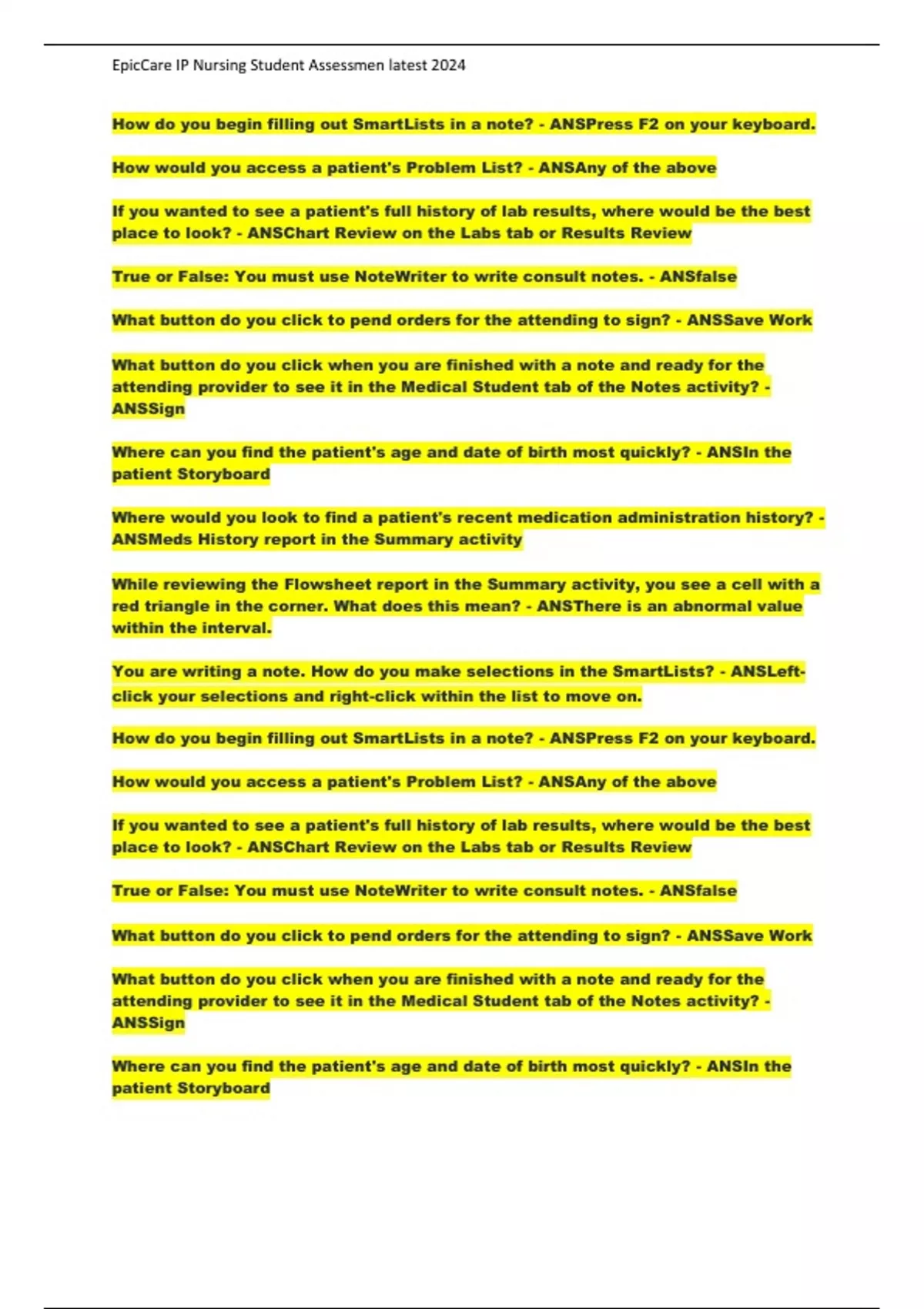 EpicCare IP Nursing Student Assessmen latest